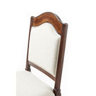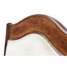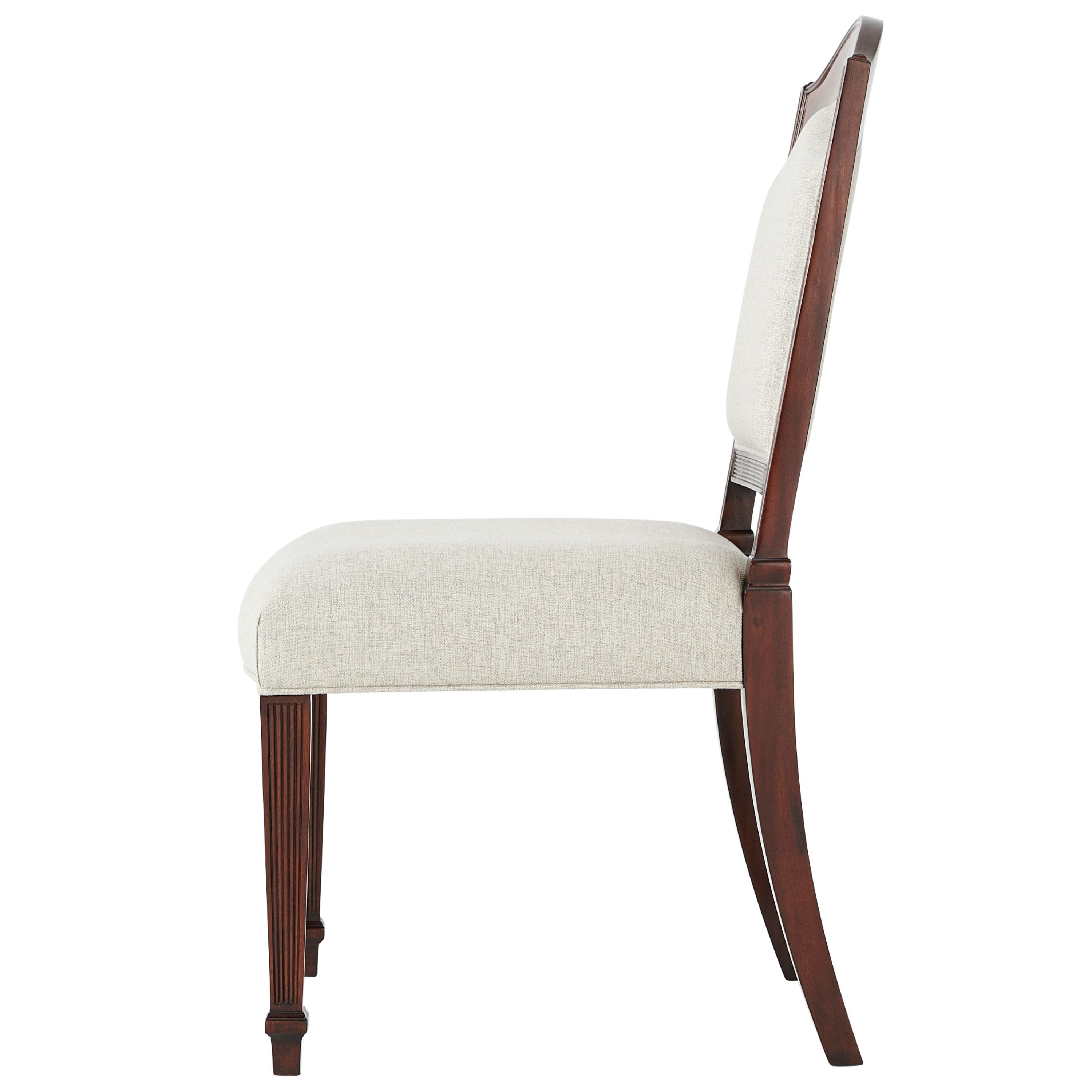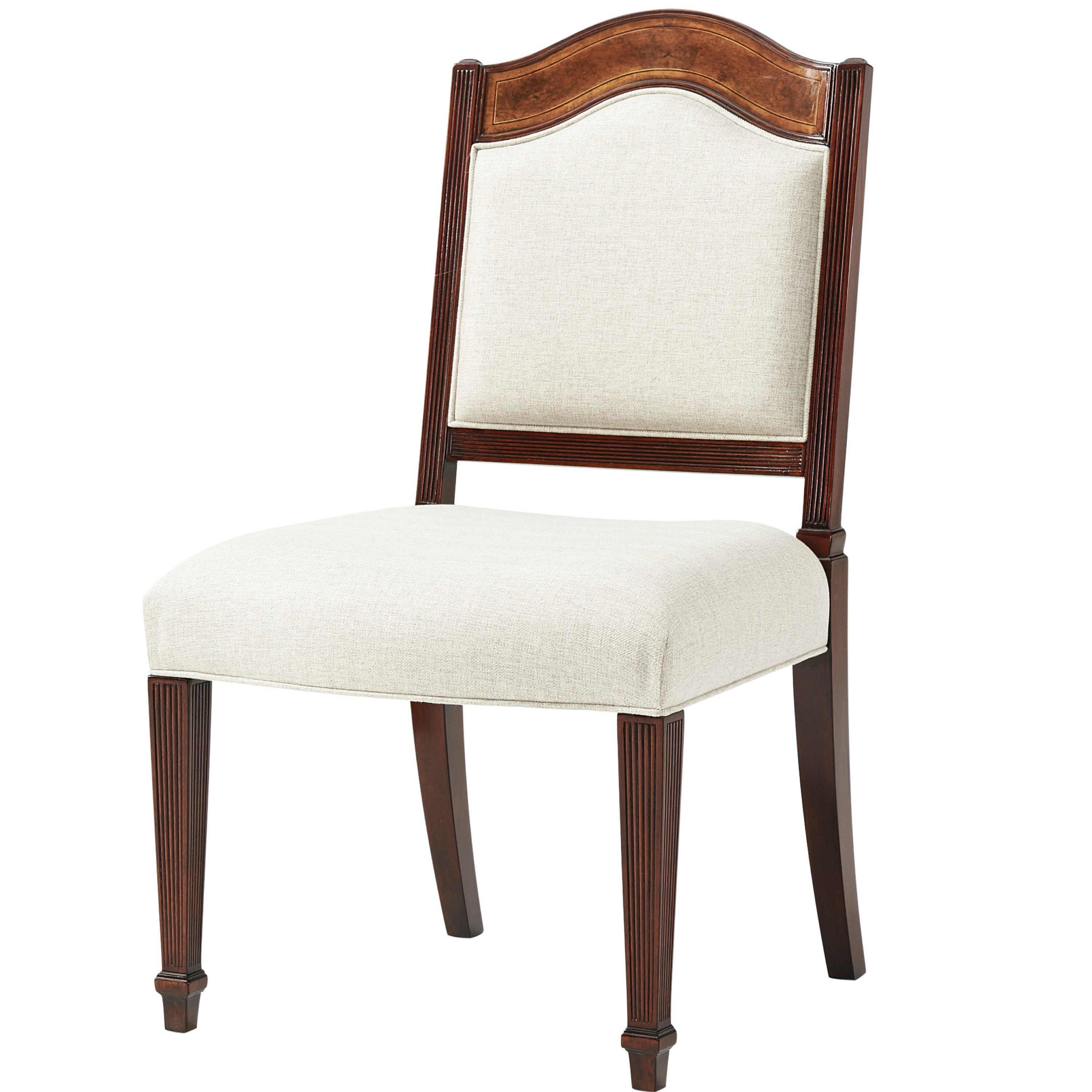 A fine mahogany, satinwood and walnut burl veneered dining chair, the arched back with a finely veneered arched top rail between reeded uprights and above a padded back and bowed seat, on reeded square tapering legs with spade feet. Inspired by an 18th century original by Thomas Sheraton.