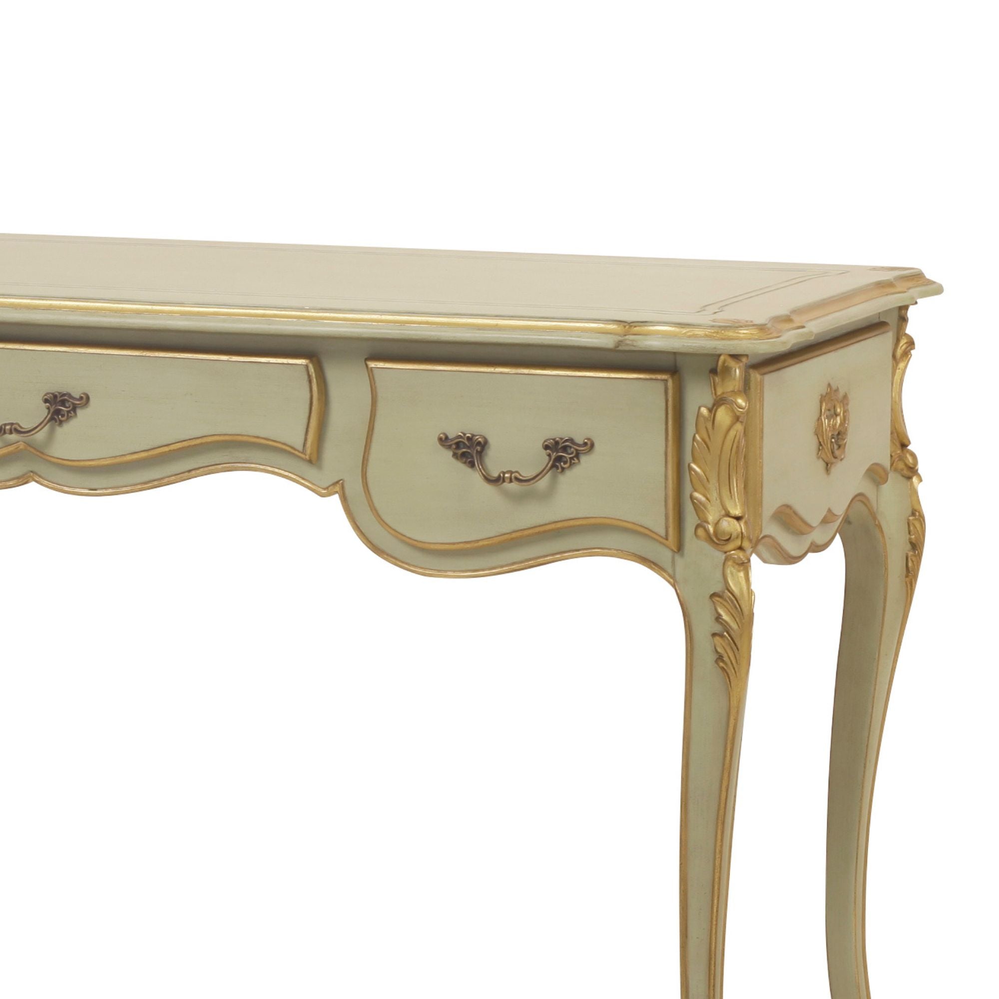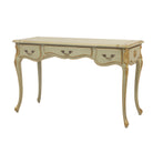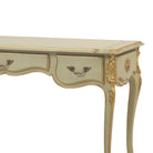 The Angela Dressing Table in green is a refined expression of classic elegance, crafted in wood with graceful cabriole legs and soft gilded accents. Its cream finish with subtle green undertones and ornate gold detailing evokes timeless sophistication, while the three-drawer design offers both beauty and functionality. A statement piece for any dressing room or bedroom, balancing artistry with everyday luxury.