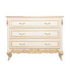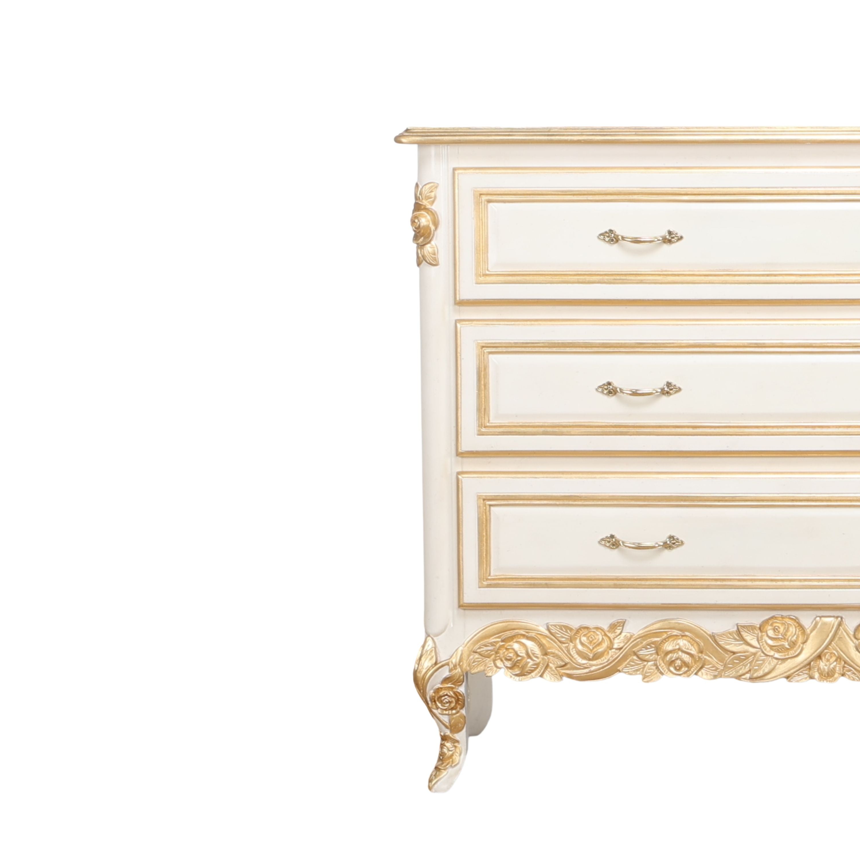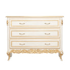 Refined and romantic, the Élise Gilded Drawer Chest features three generous drawers framed in hand-applied gold detailing and sculpted floral accents. With its ivory finish and elegant profile, it brings both charm and functionality to elevated interiors.