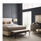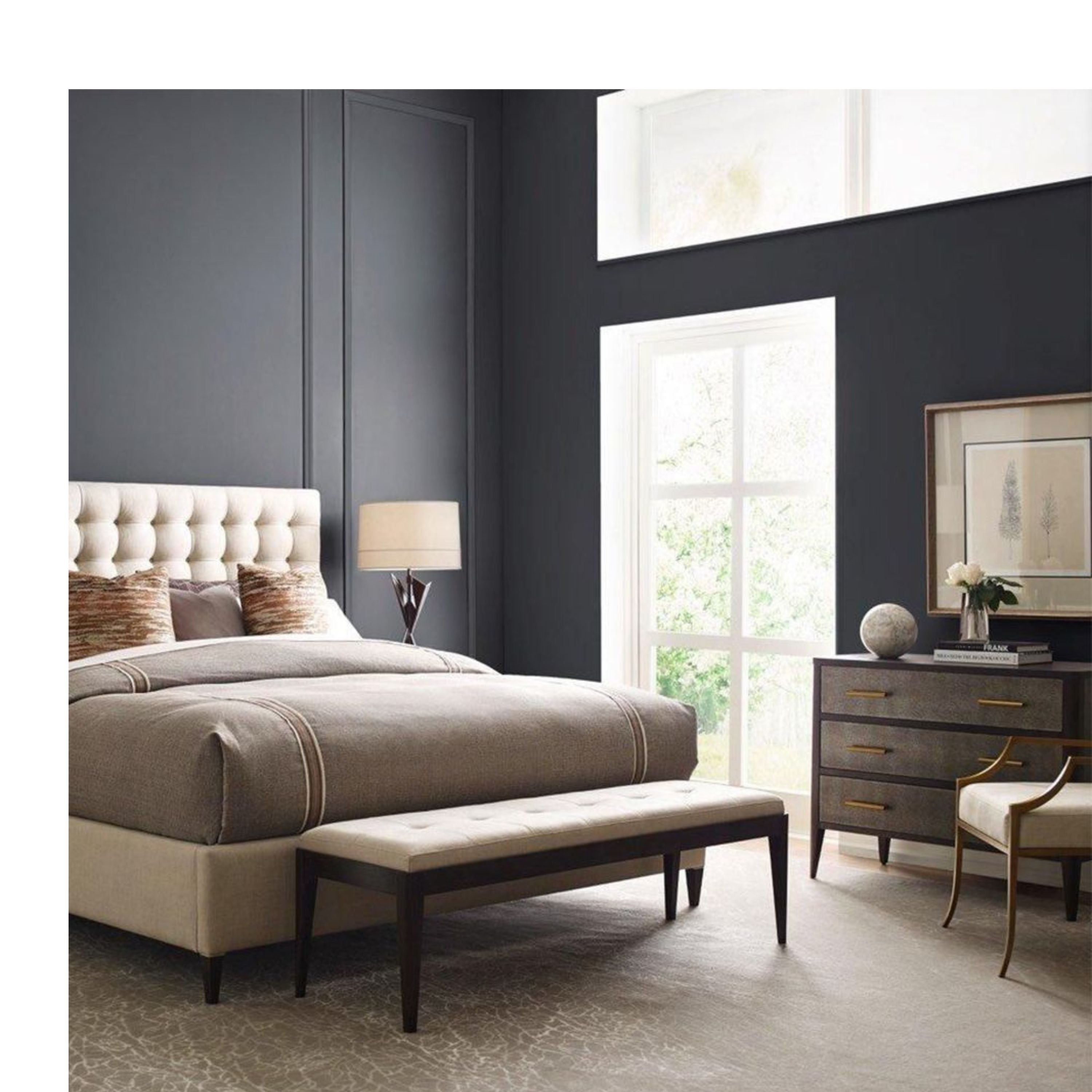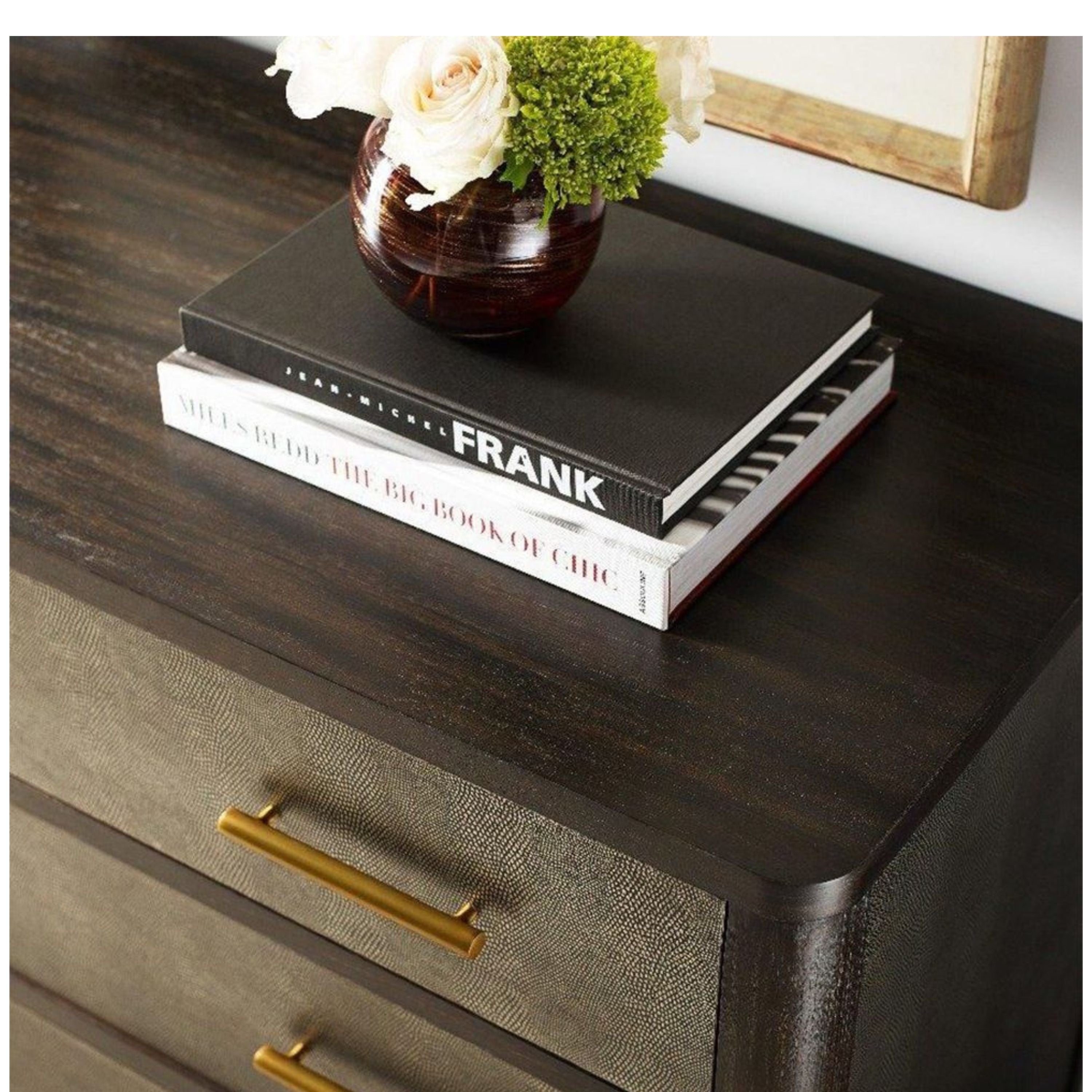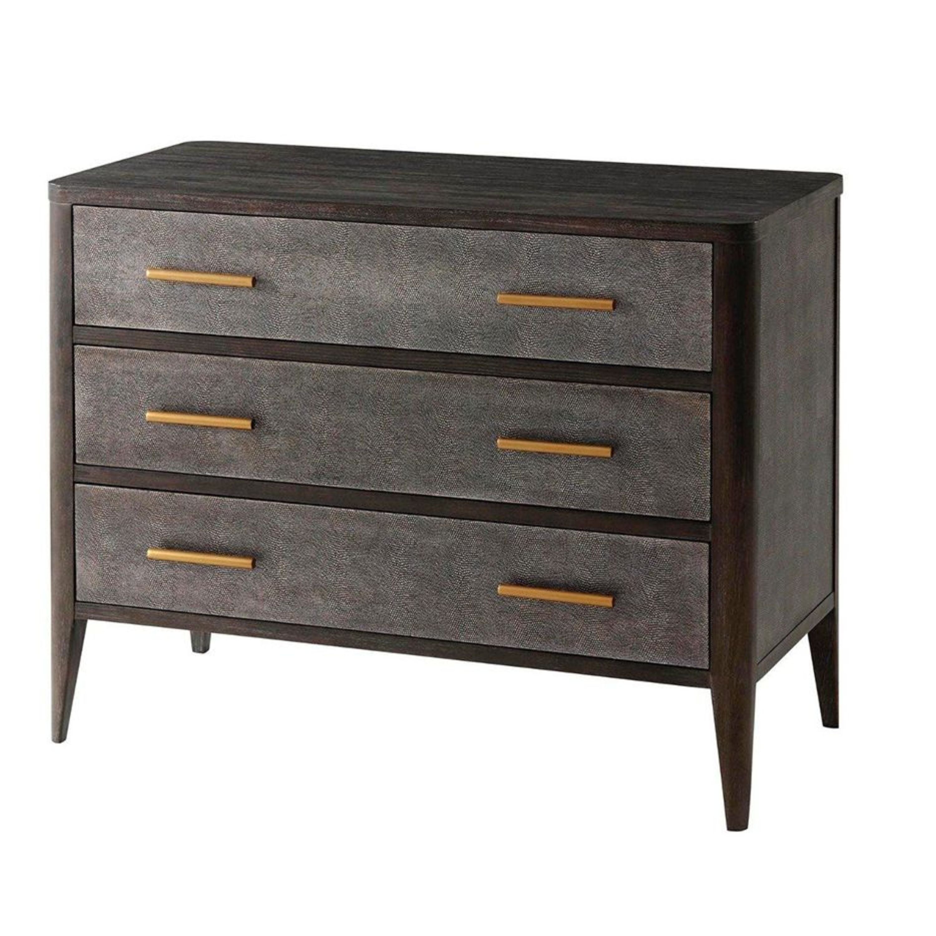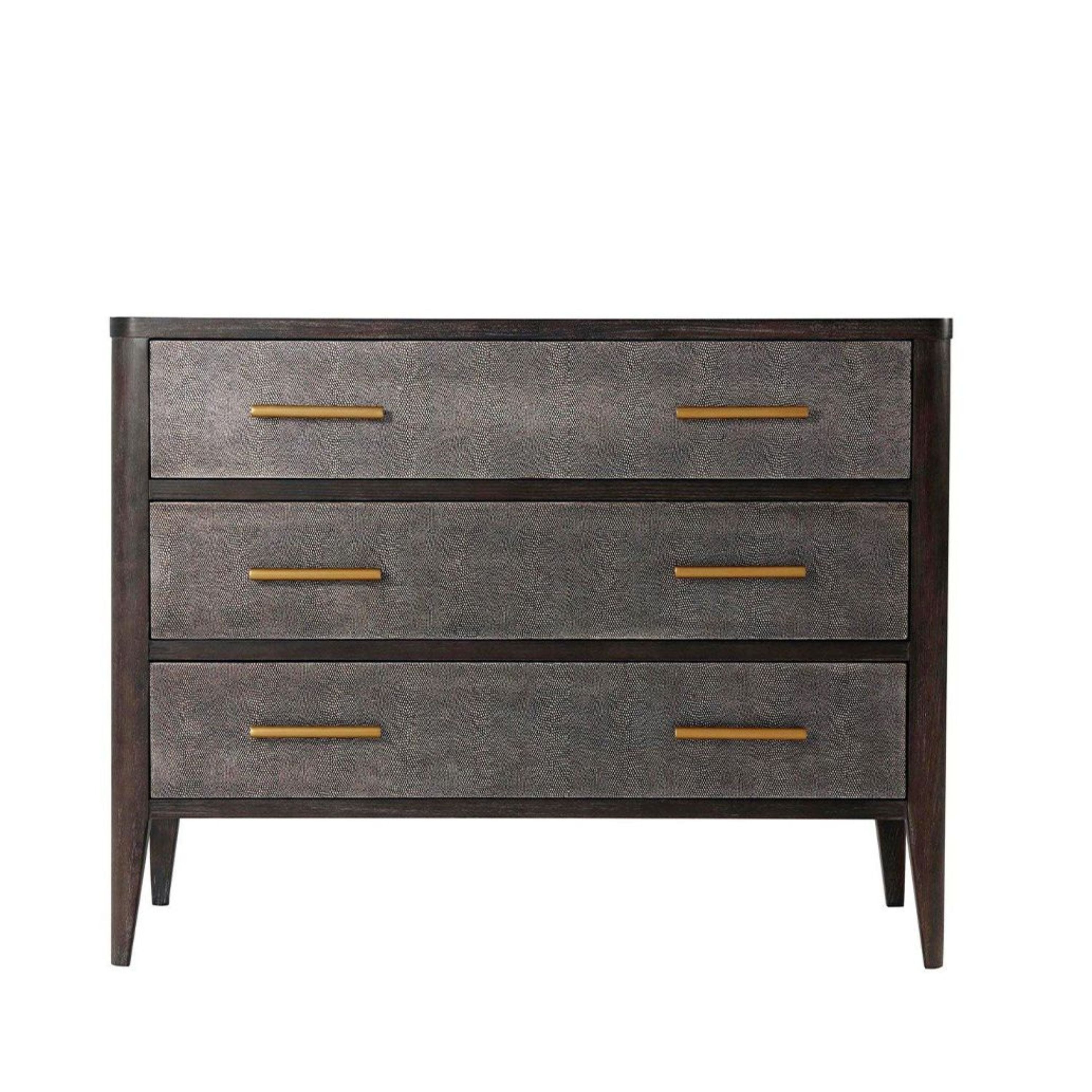Rowan Finish Primavera Veneer and Beech. Three Tempest Finish Komodo Embossed Leather Drawers and Sides. Brushed Brass Finish Handles