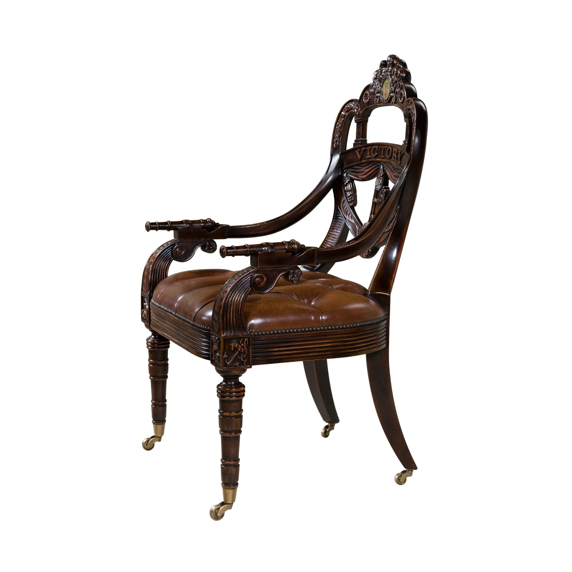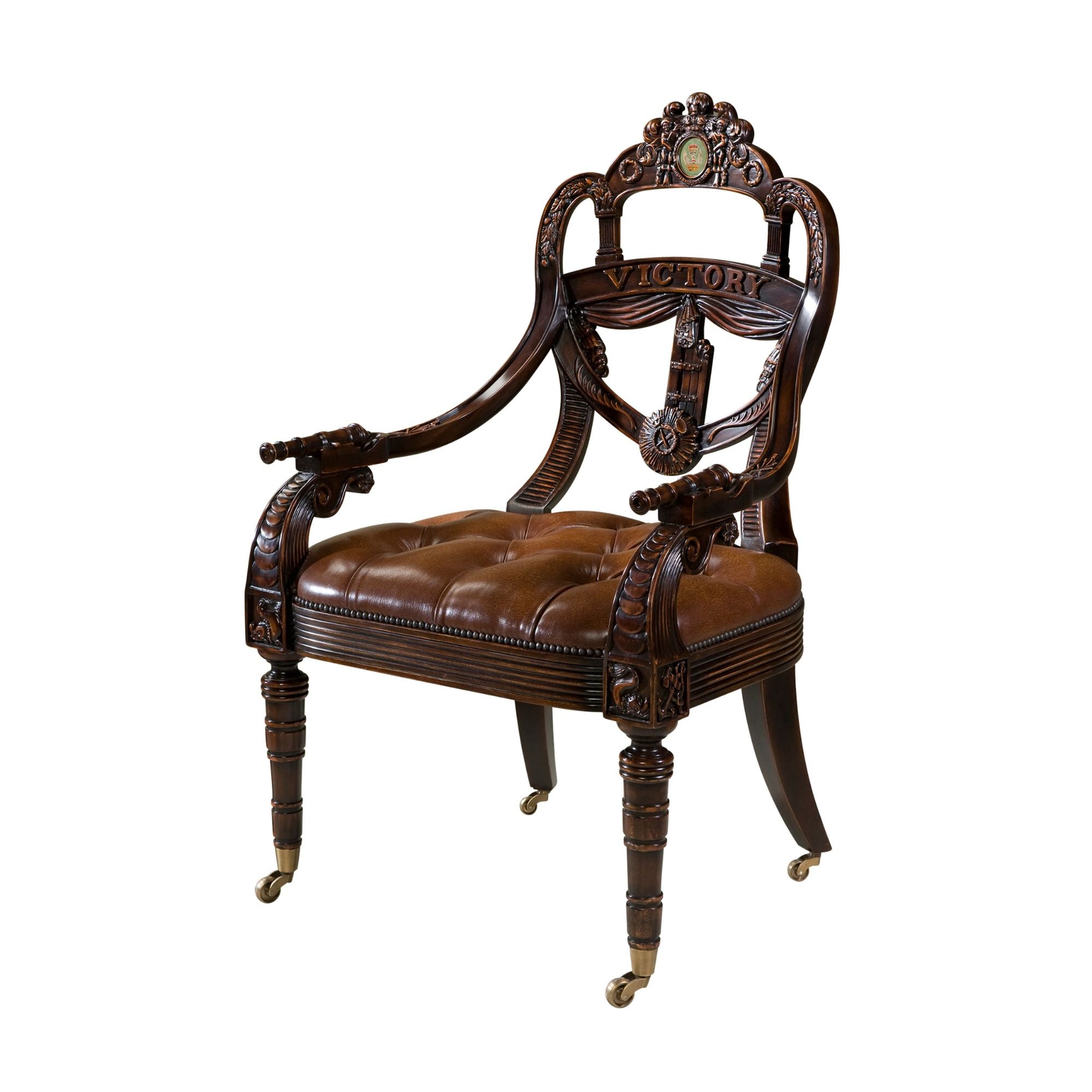 A hand-carved mahogany library armchair, the back in the shape of a ship's transom carved with a Coat of Arms centred by the Spencer crest, flanked by Victory wreaths.
