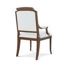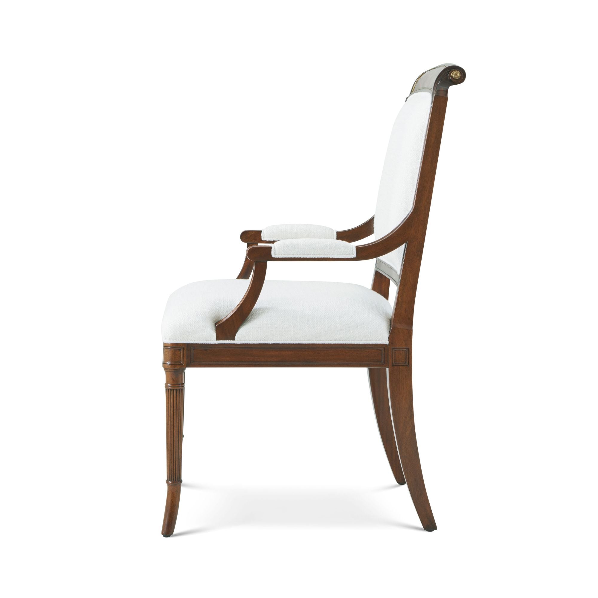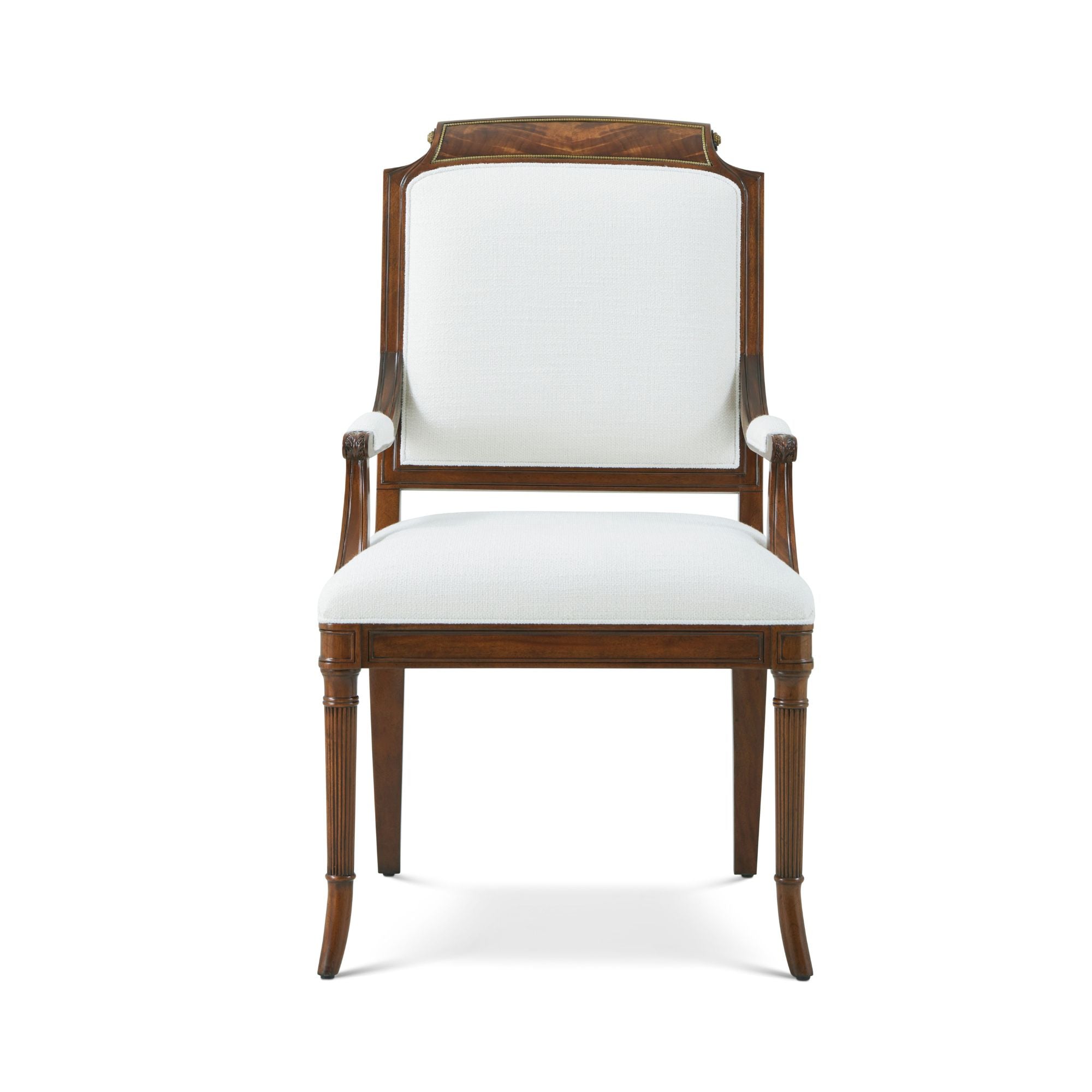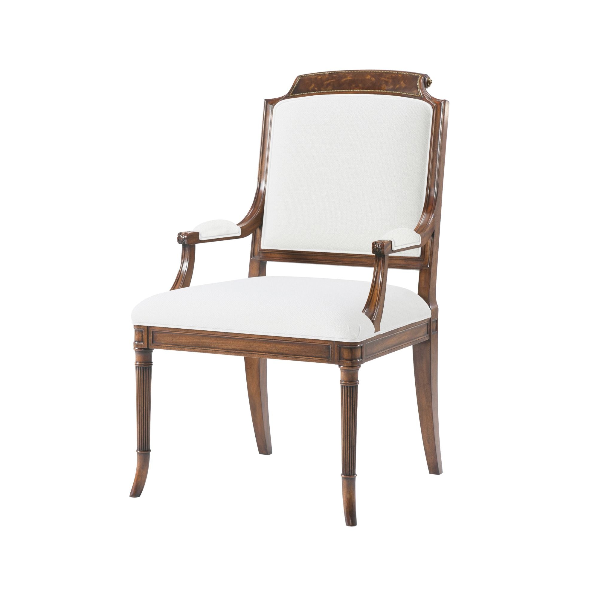 A finely carved mahogany dining armchair, the upholstered framed back with a swirl mahogany veneered scroll over toprail with fine brass details, the upholstered seat between part-padded arms, on panelled seat rails with turned and fluted legs with splay feet.