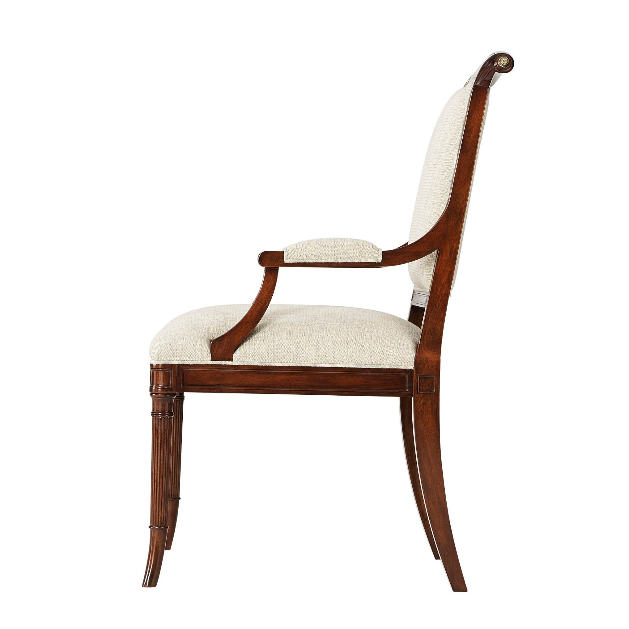 A finely carved mahogany dining armchair, the upholstered framed back with a swirl mahogany veneered scroll over toprail with fine brass details, the upholstered seat between part-padded arms, on panelled seat rails with turned and fluted legs with splay feet.