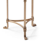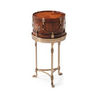 A mahogany and brass drum-shaped box on a brass stand with lion claw feet joined by concave stretchers and painted with the Spencer coat of arms.