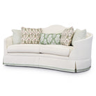 A gracefully curved crescent-front sofa designed for refined interiors. Upholstered in Carlow Taupe, it features a softly shaped back, tailored skirt, and elegant proportions. Styled with coordinated contrast and coral accent pillows, this piece offers luxurious comfort with timeless sophistication.