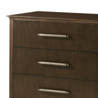 The Lido Dresser, crafted from Prima Vera in our Bistre finish, features a sophisticated tapered silhouette with 6 reeded drawer fronts. The custom forged hardware, finished in a dark rubbed bronze, echoes the reeded details throughout.