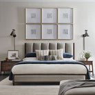 The Lido US Bed II features an upholstered platform frame and sophisticated channeled headboard, set within our dark Bistre finished Prima Vera veneer.