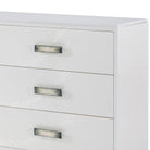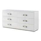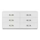 The Panos Dresser takes the collection's signature hand-painted ombre starburst design and scales it down for application across its six horizontal drawer pulls with stainless steel accents. The smooth, lacquered top and sides of the piece subtly counter the drawer faces, which feature a beautiful carved extension of the starburst design in a contrasting bright white resin.
