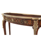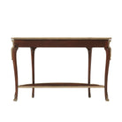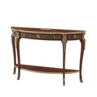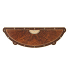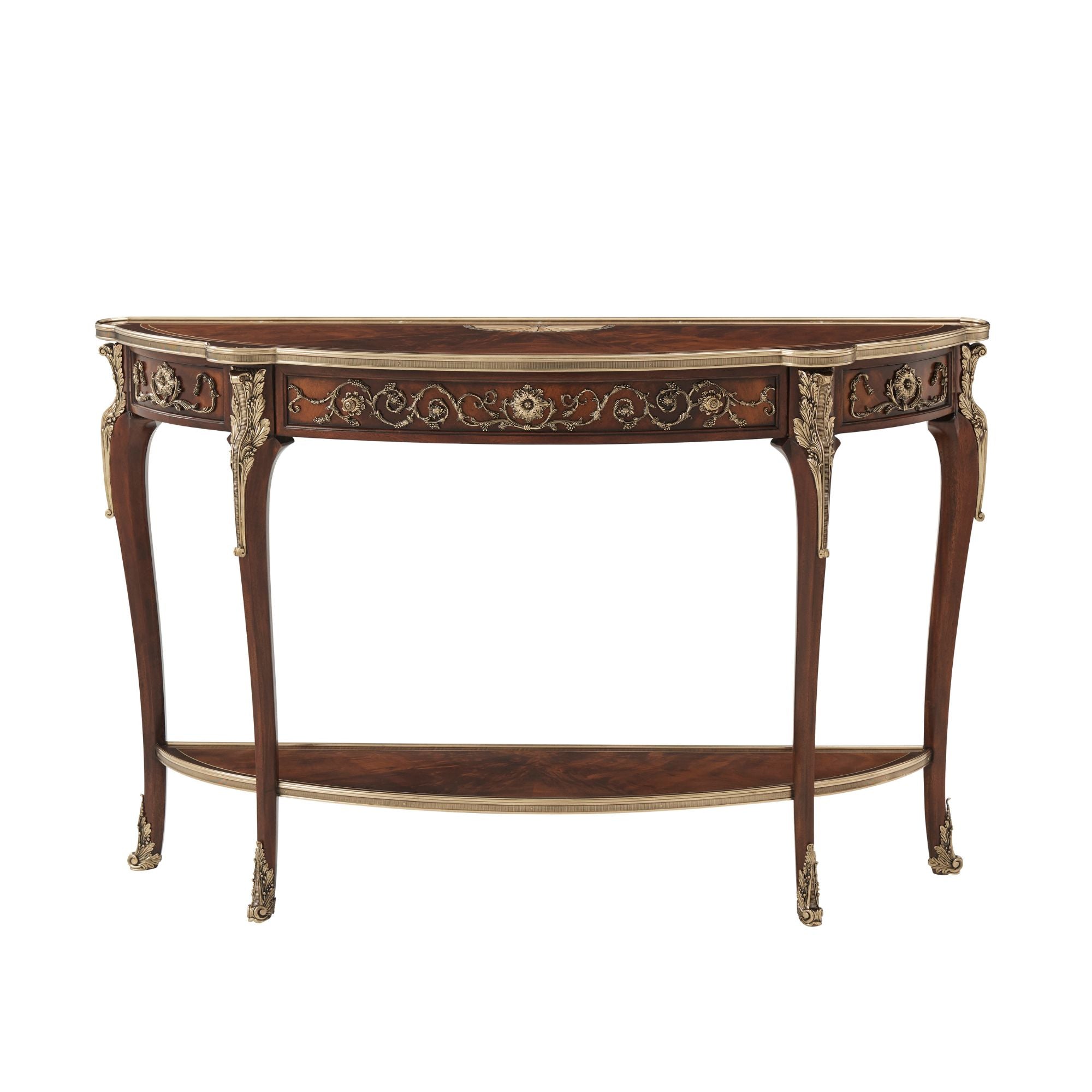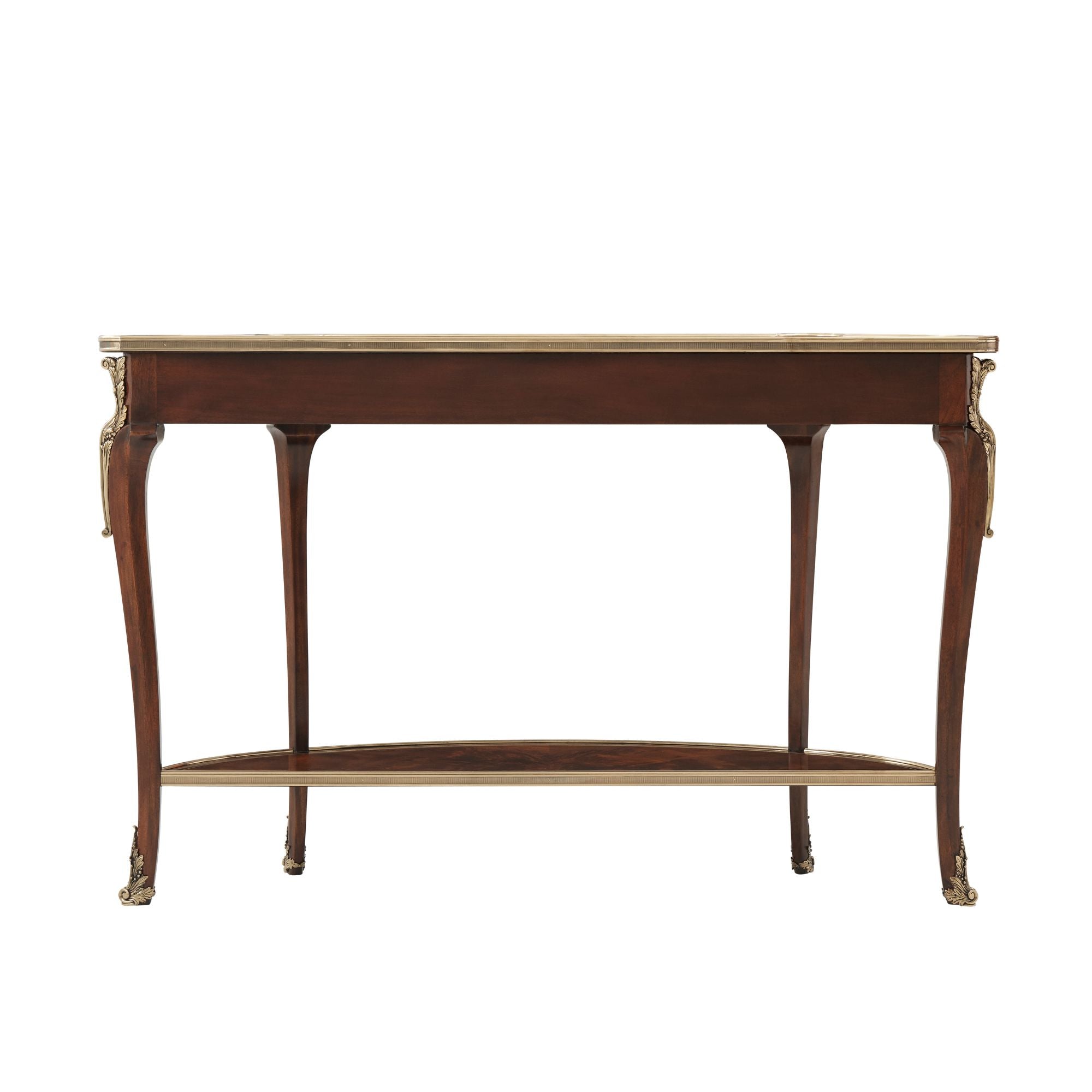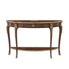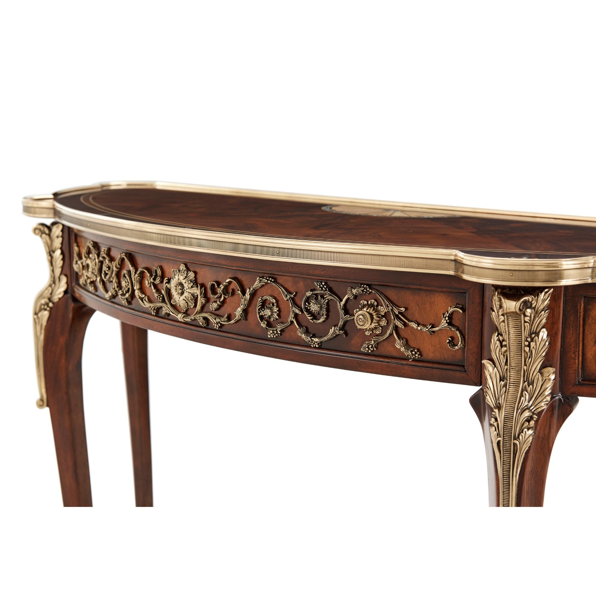 A fine flame mahogany and Morado banded console table with fan marquetry, brass line and mother of pearl inlays, the bowfront brass-bound top with lobed corners, above a Nickel Brass Finish cast brass acanthus scroll applied frieze with one drawer, on acanthus cast brass capped cabriole legs with scroll cast feet and joined by a brass-bound and veneered undertier.