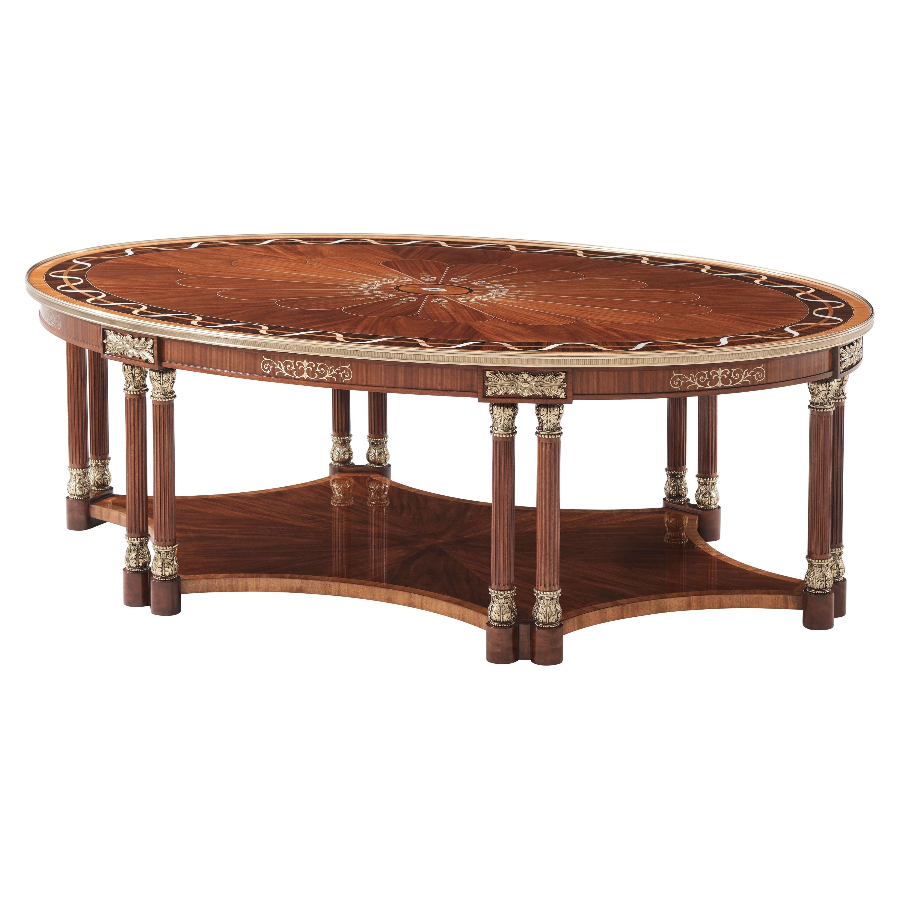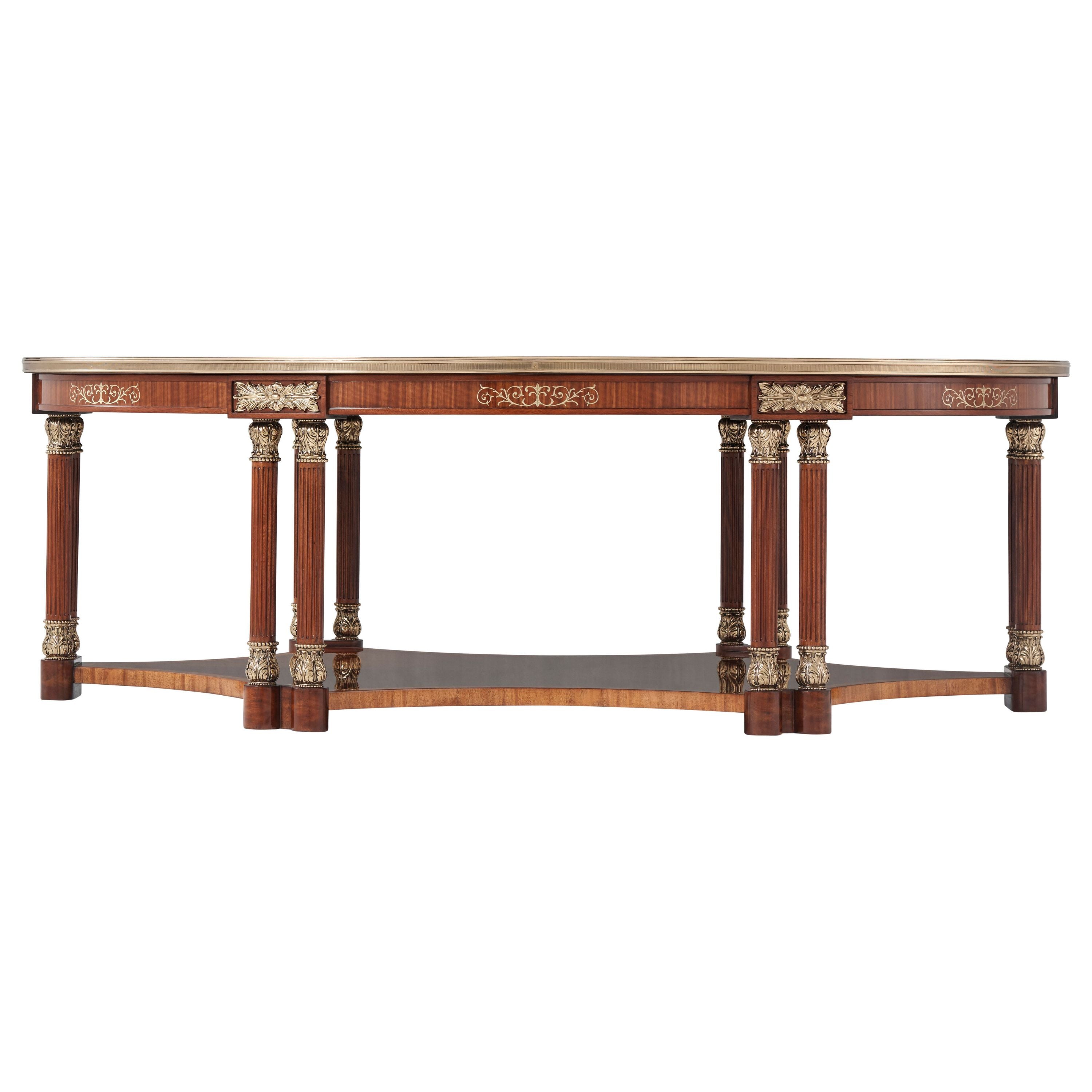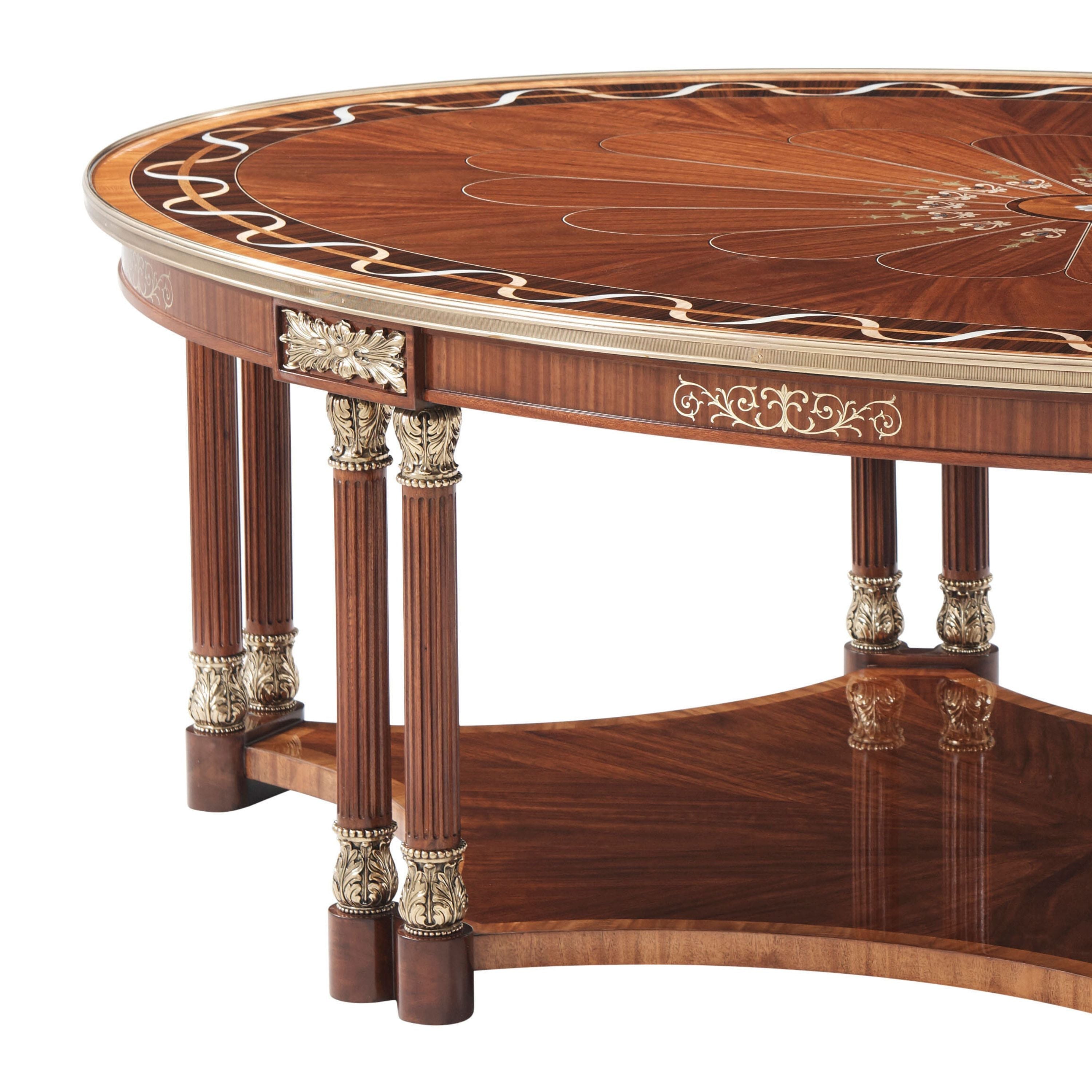 A very fine mahogany and etimoe veneered cocktail table, the Morado and Primavera crossbanded top with fine stringing and a paper twist marquetry design in sycamore and mother of pearl, inlaid to the center with a bold flowerhead with mother of pearl floral details, bound in brass above a paneled frieze with floral brass accents and brass inlay, on fluted columns with acanthus capitals and bases, joined by a Primavera crossbanded concave sided undertier.