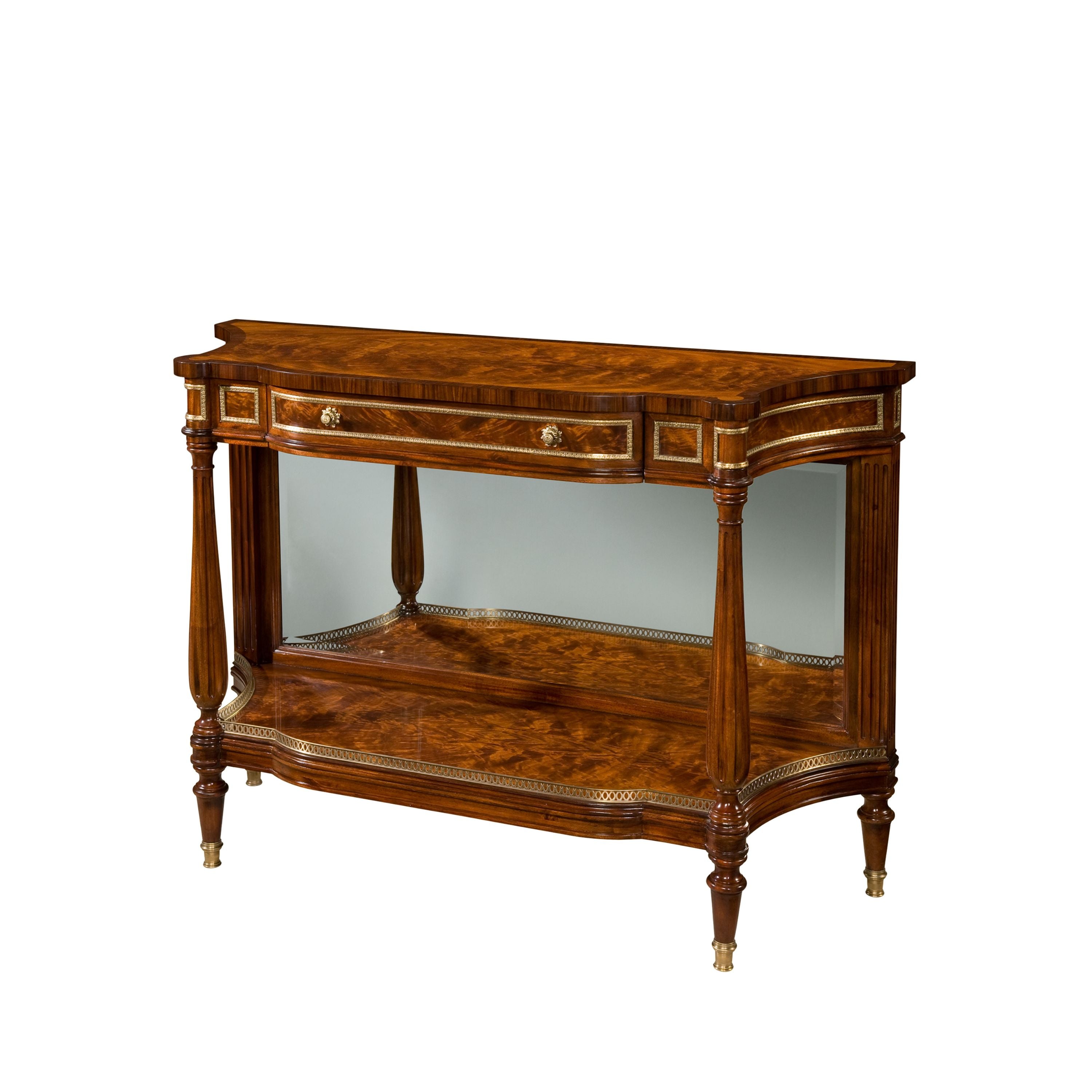 A flame veneered and morado banded serpentine credenza, with brass mounts, one frieze drawer, mirror back, on fluted legs and undertier.