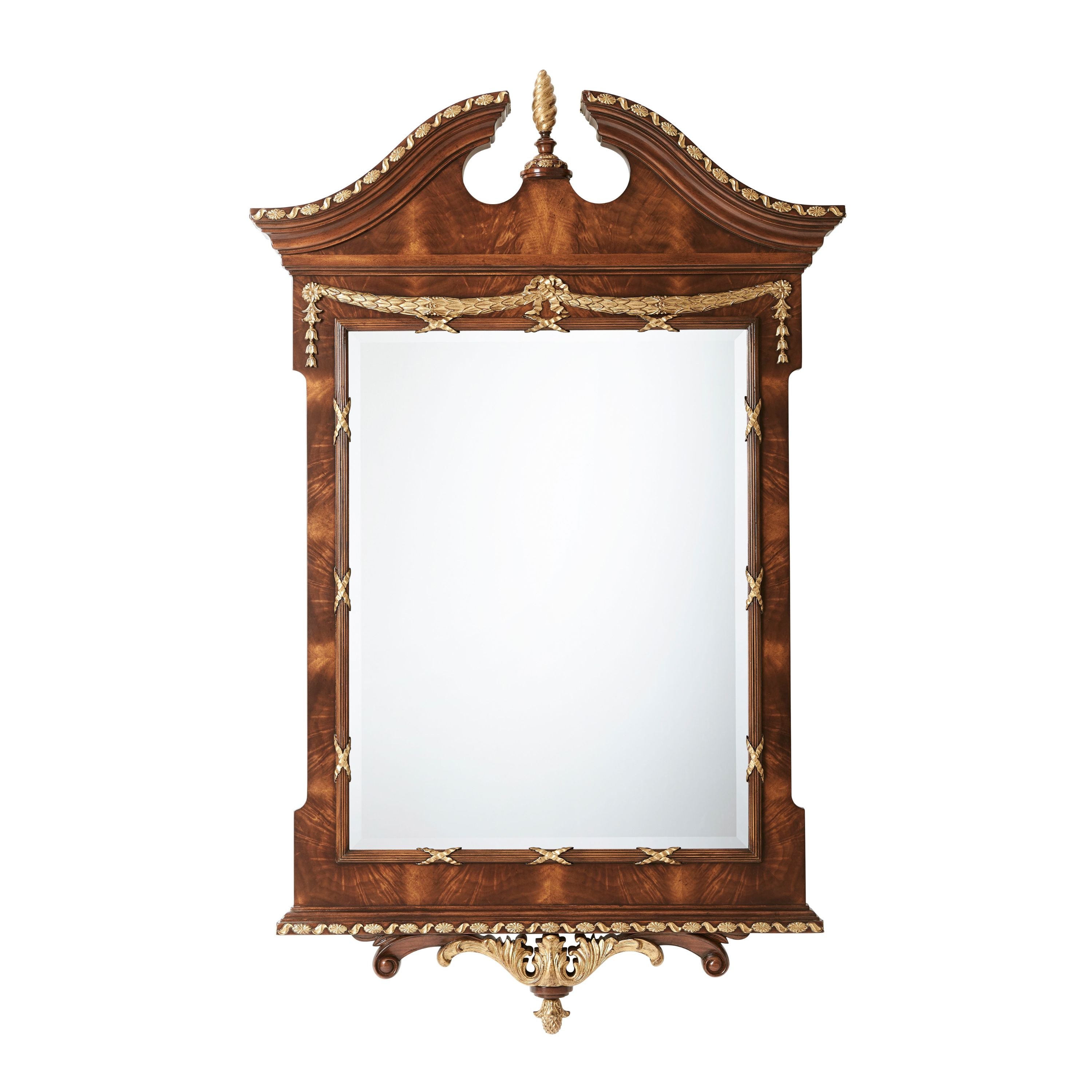 A carved mahogany, flame veneered and parcel gilt wall mirror, the arched broken swan neck crest with a carved moulding and centred by a spiral carved pine cone finial, the rectangular bevelled edge mirror below framed by a bound reed slip with swag carving above and a leaf carved pendant apron below. Inspired by the George III bed in the India silk Room, circa 1760.