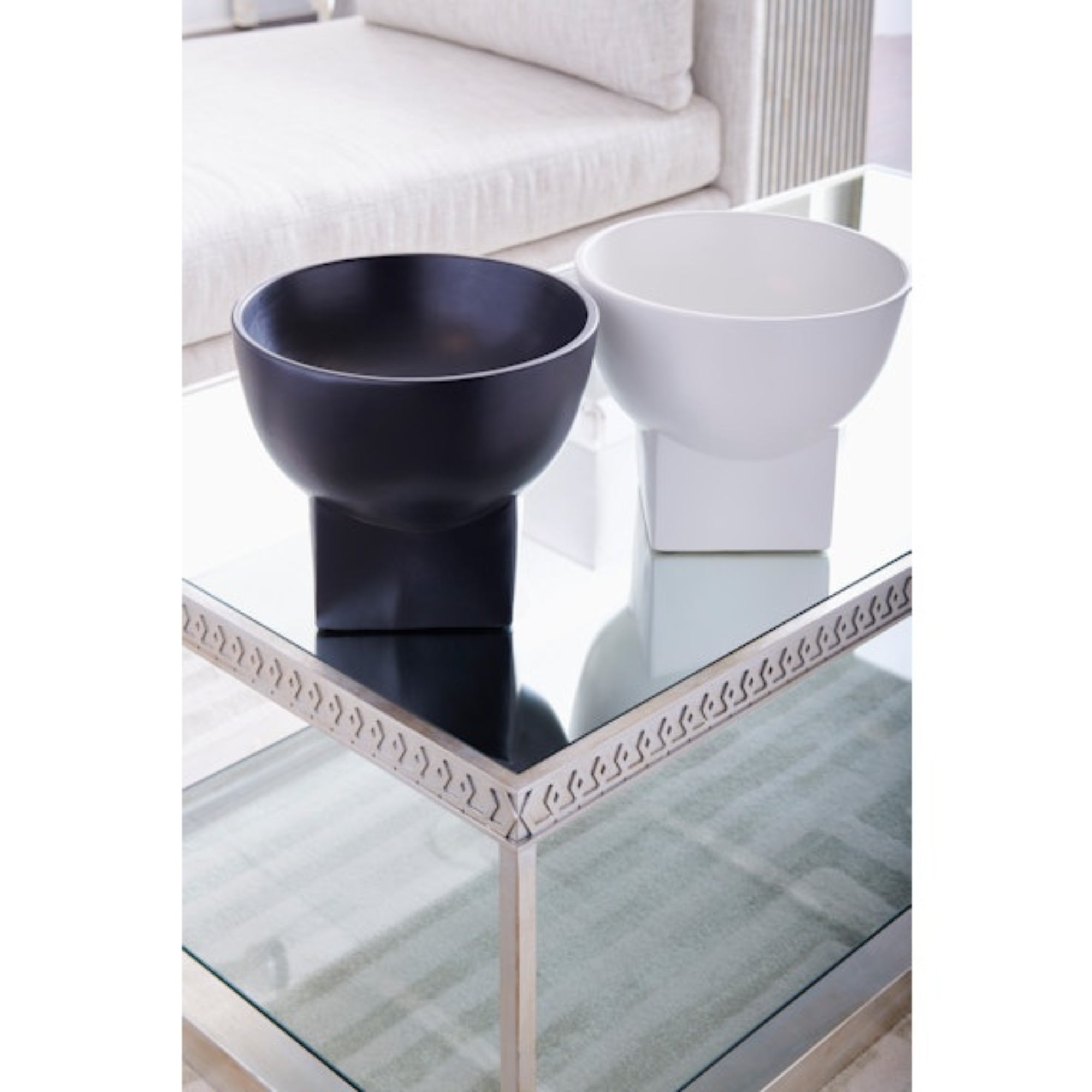Simple and sleek, this bowl makes a sophisticated design statement. Matte white ceramic bowl on square base. Designed by Bradshaw Orrell.