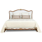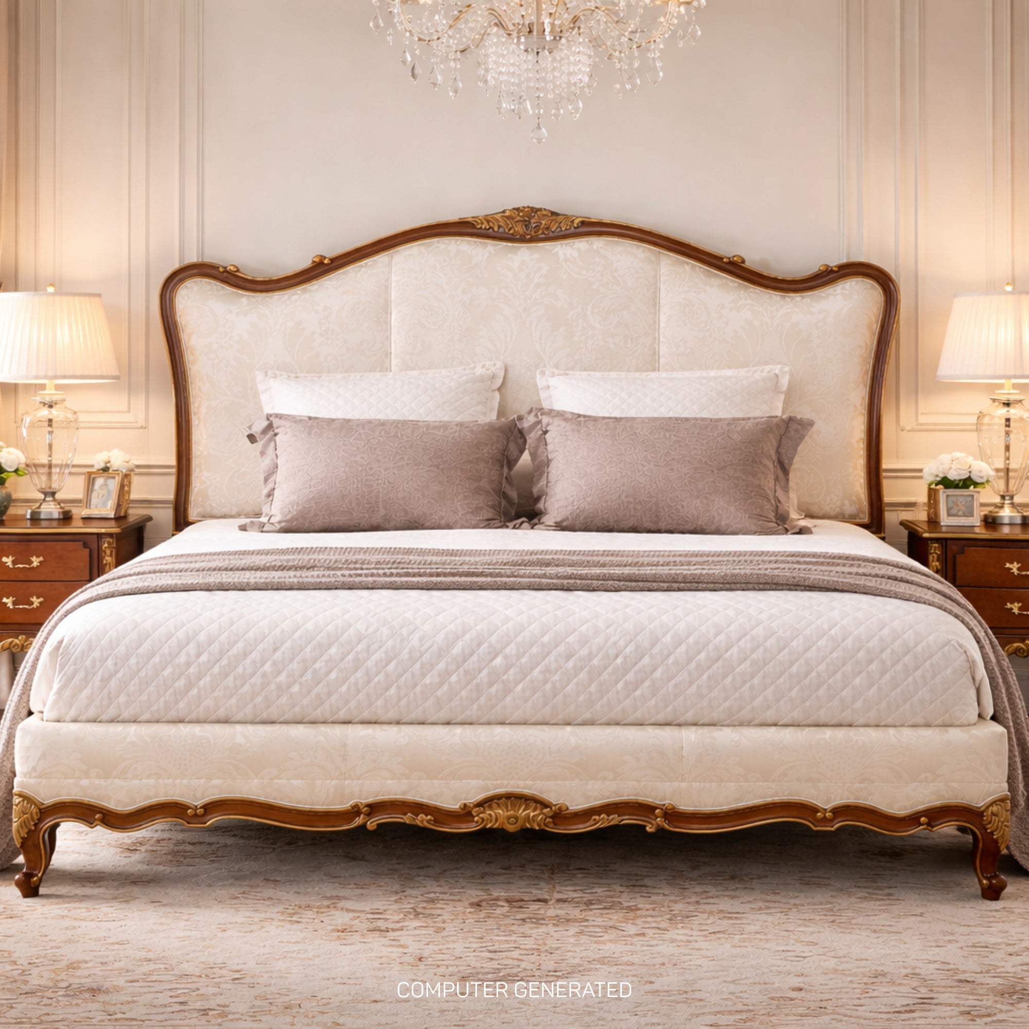 With its sweeping curves, gold-accented crest, and intricately patterned upholstered headboard, the Aveline Bed brings graceful elegance to the classic bedroom. Crafted in a rich wood finish, it balances softness and structure with timeless charm. An heirloom piece that defines refined rest.