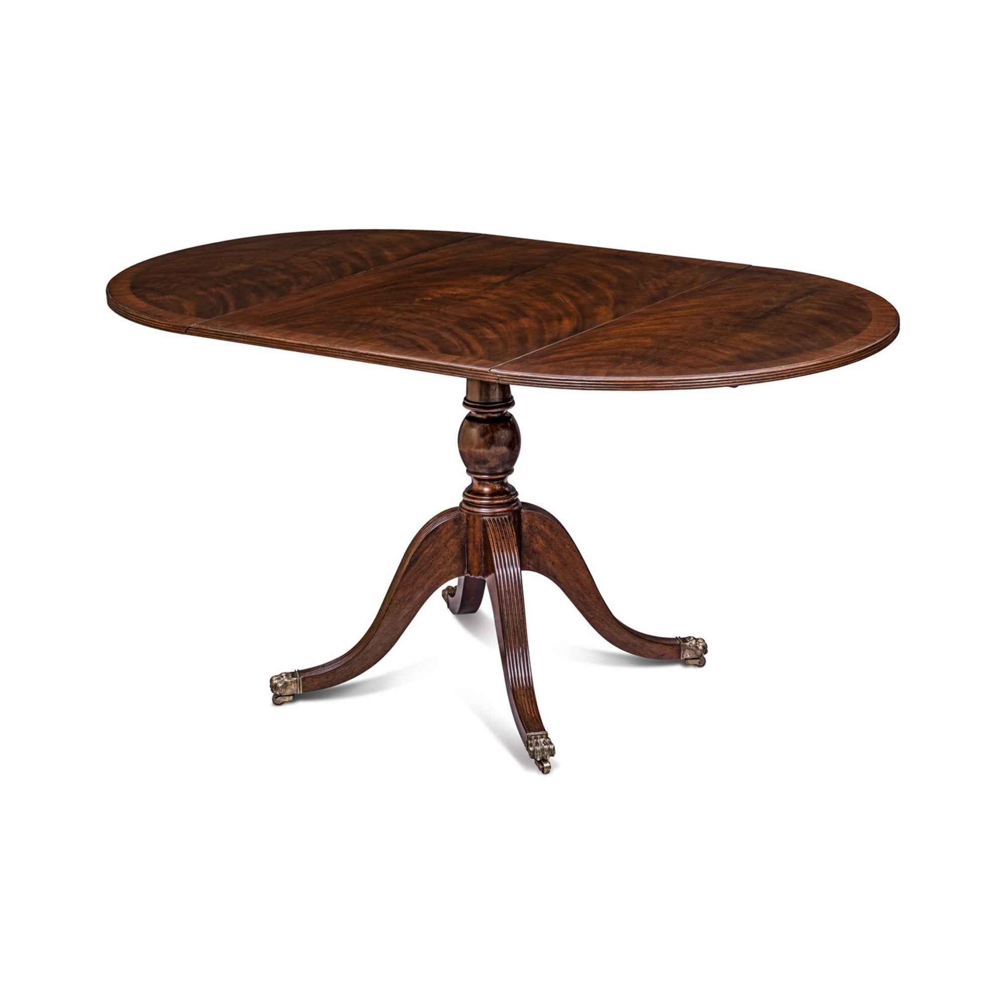 A refined expression of traditional British craftsmanship, the Aston Court Oval Dining Table features a richly figured mahogany veneer top showcasing dramatic natural grain patterns. The elegant oval silhouette is supported by a turned pedestal base flowing into three gracefully curved legs, each terminating in subtle carved detailing. Its balanced proportions and timeless form make it an ideal centerpiece for formal dining rooms and sophisticated interiors. Designed to embody heritage elegance with enduring appeal.