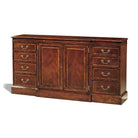 A refined interpretation of Regency elegance, this sideboard is masterfully crafted in crotch mahogany and movingue, showcasing richly figured veneers framed with subtle banding. The balanced composition features a central cabinet flanked by graduated drawers, including a dedicated cutlery drawer and a practical pullout shelf for service. Polished brass handles add a distinguished accent, enhancing its formal presence. Ideal for grand dining rooms, this piece offers both architectural symmetry and generous storage within a timeless classic silhouette.