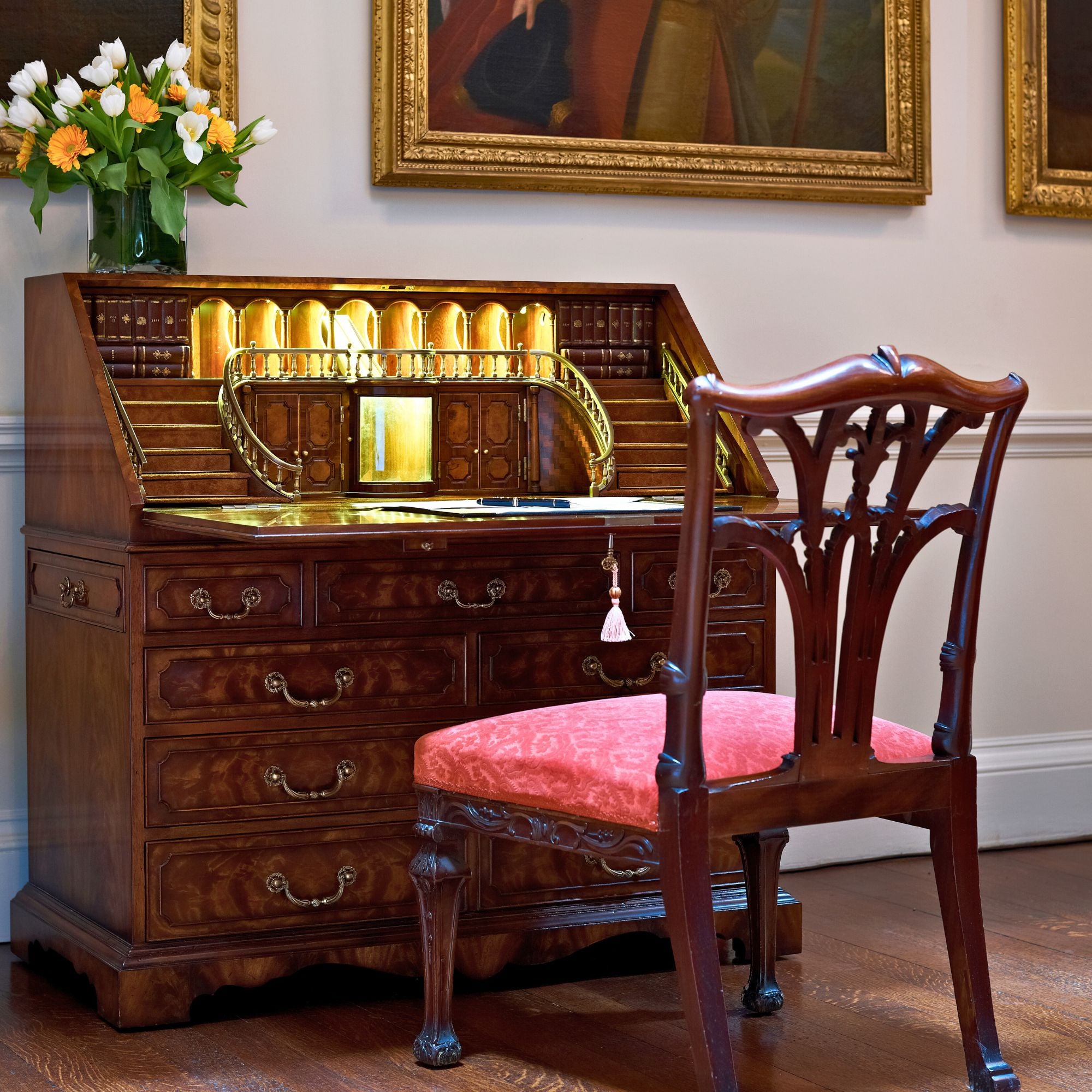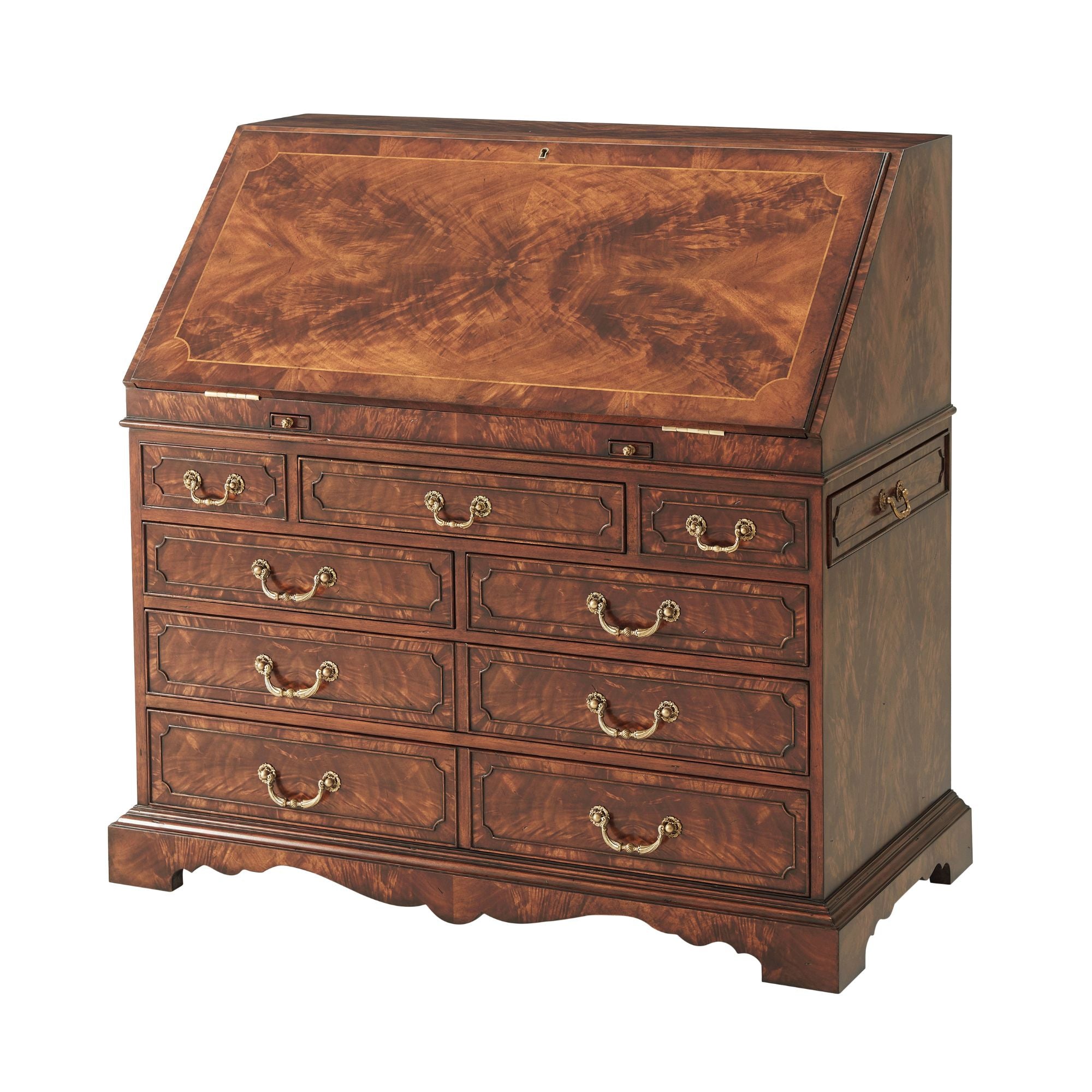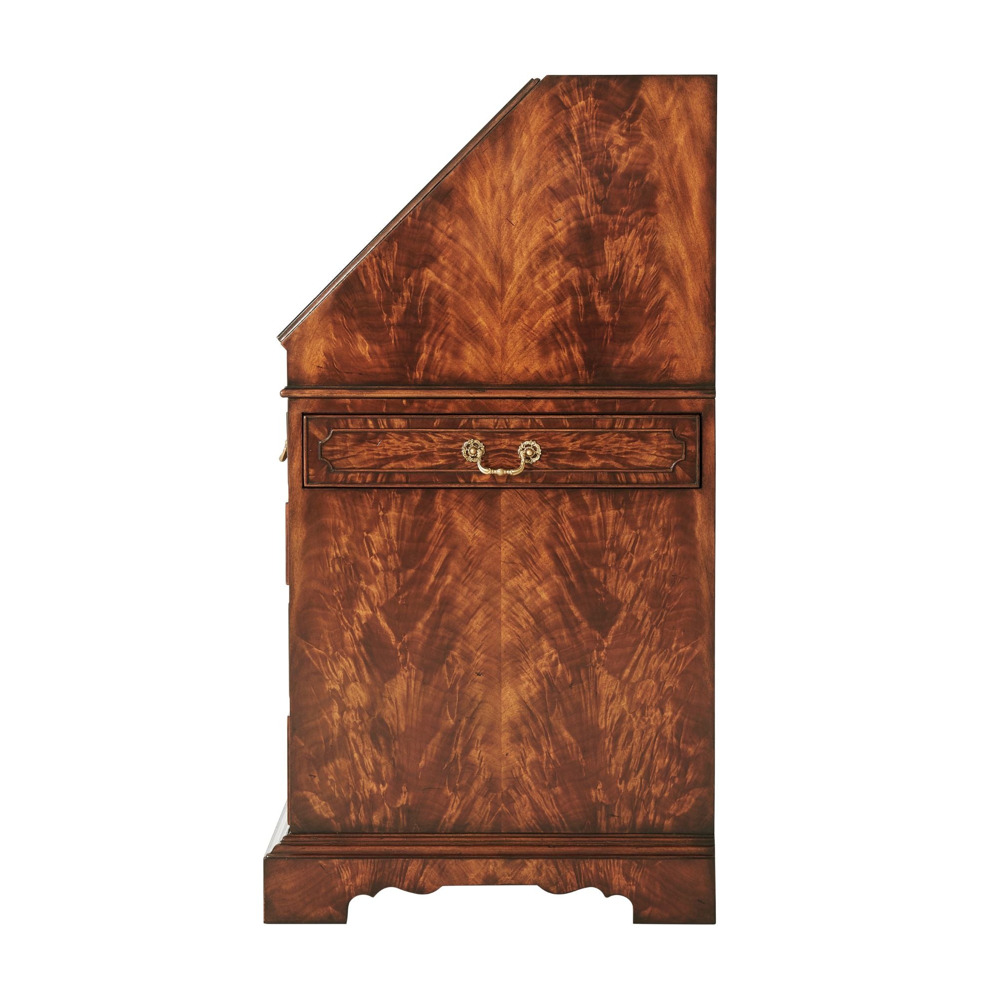 A fine flame veneered bureau, the sloping fall enclosing a fitted interior of faux book and hidden drawers and cabinets, the staircase gallery interior, above a short frieze drawer flanked by dummy drawers, with two short and two long drawers below, on bracket feet; the sides with further drawers and hidden drawers.