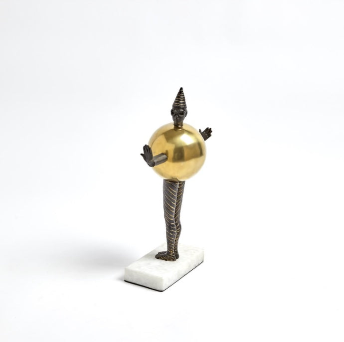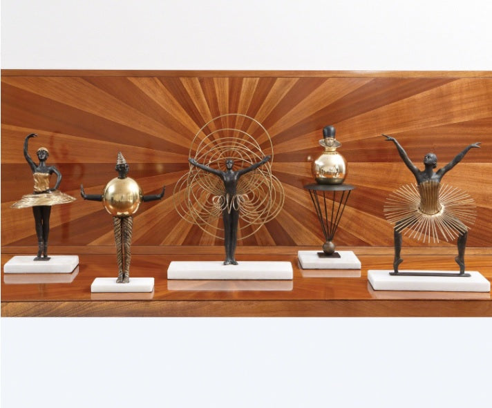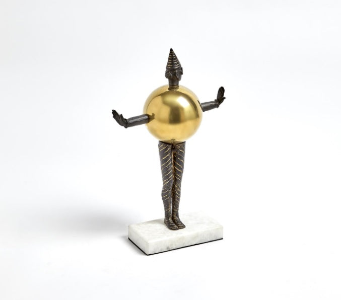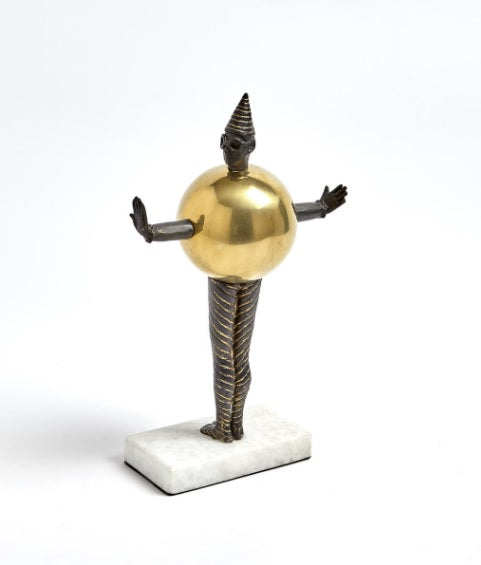 Man becomes the machine in our Bauhaus figure collection. Inspired by Schlemmer's "Triadisches Ballett", our figurines take Schlemmer's avant-garde aesthetic and the idea of man as machine and shows the heart behind our human impulses. This highly stylized collection illustrates the Bauhaus ethos and displays the human body as abstract art. The play on Schlemmer's fantastic costuming is seen here in each piece. Available in five unique sculptures all constructed from a mix of cast iron, iron wire, and sheet brass, with painted gold details.