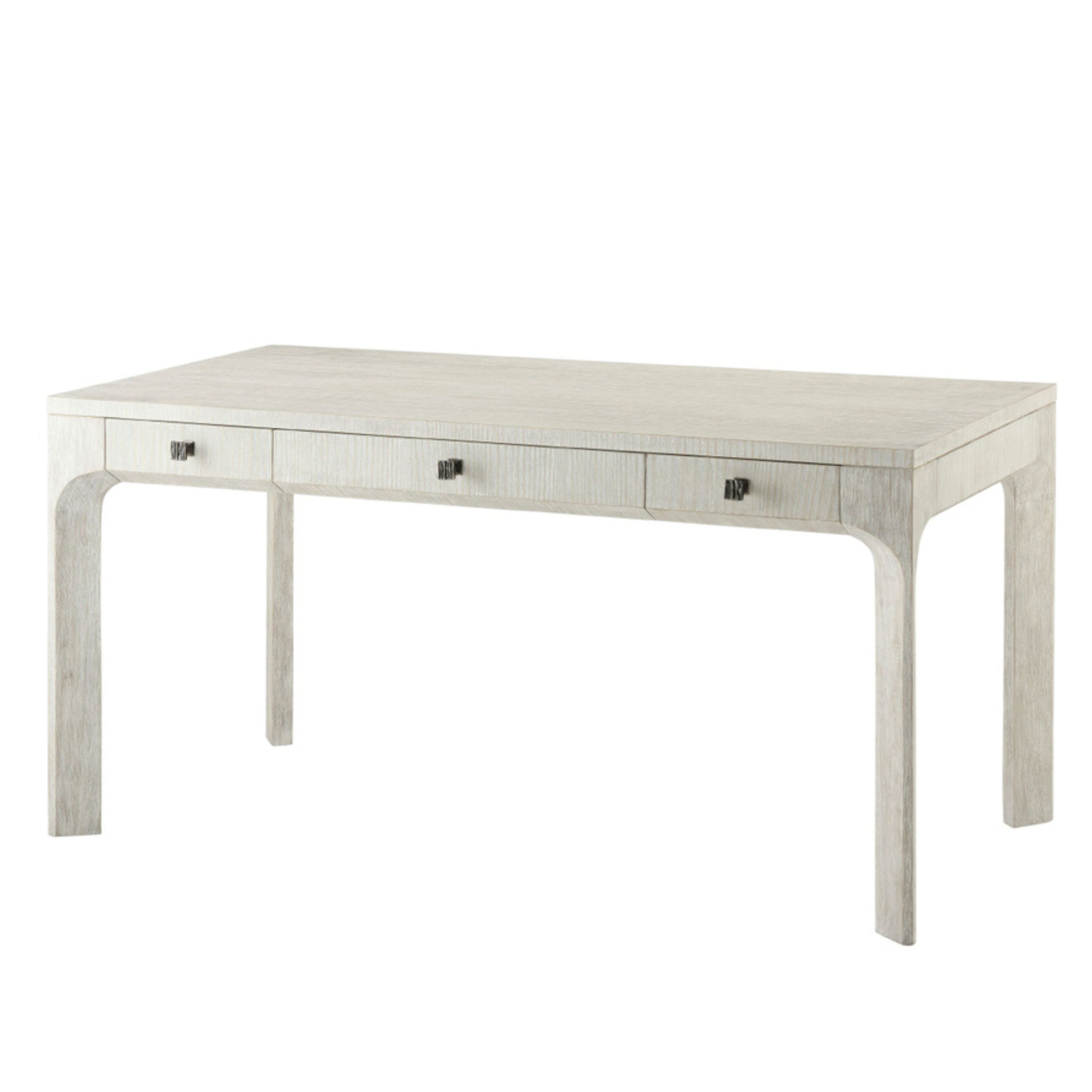 Handcrafted wire-brushed cerused pine in a light and subdued Sea Salt finish, the Breeze Desk displays three functional drawers with organic ribbed metal knobs in our Dark Sterling finish and a beveled shaped cross section.