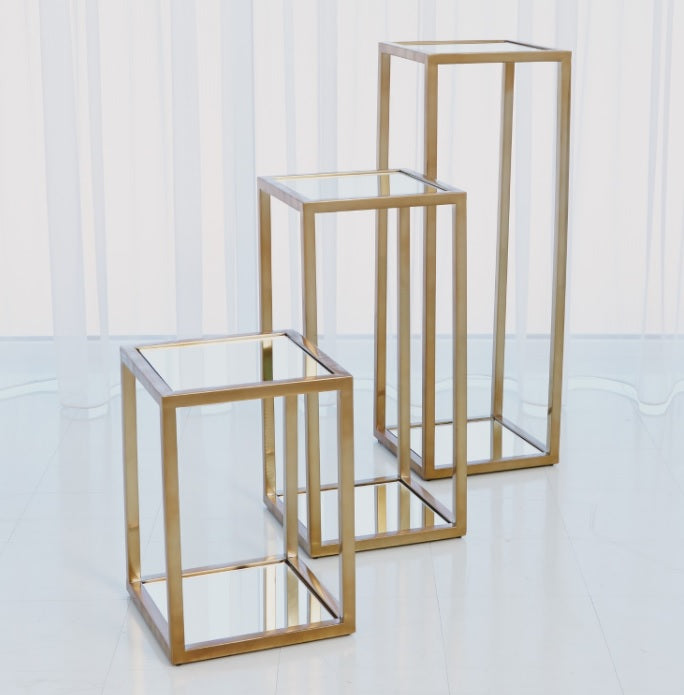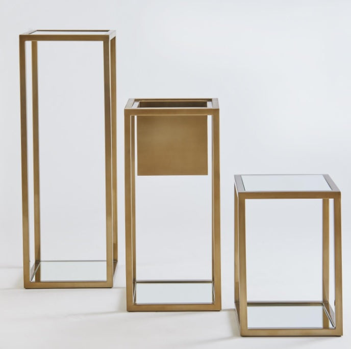 Escher pedestal/planter made of a shiny brass finished steel frame with a glass mirrored bottom and optional mirrored top when used as an optional pedestal.