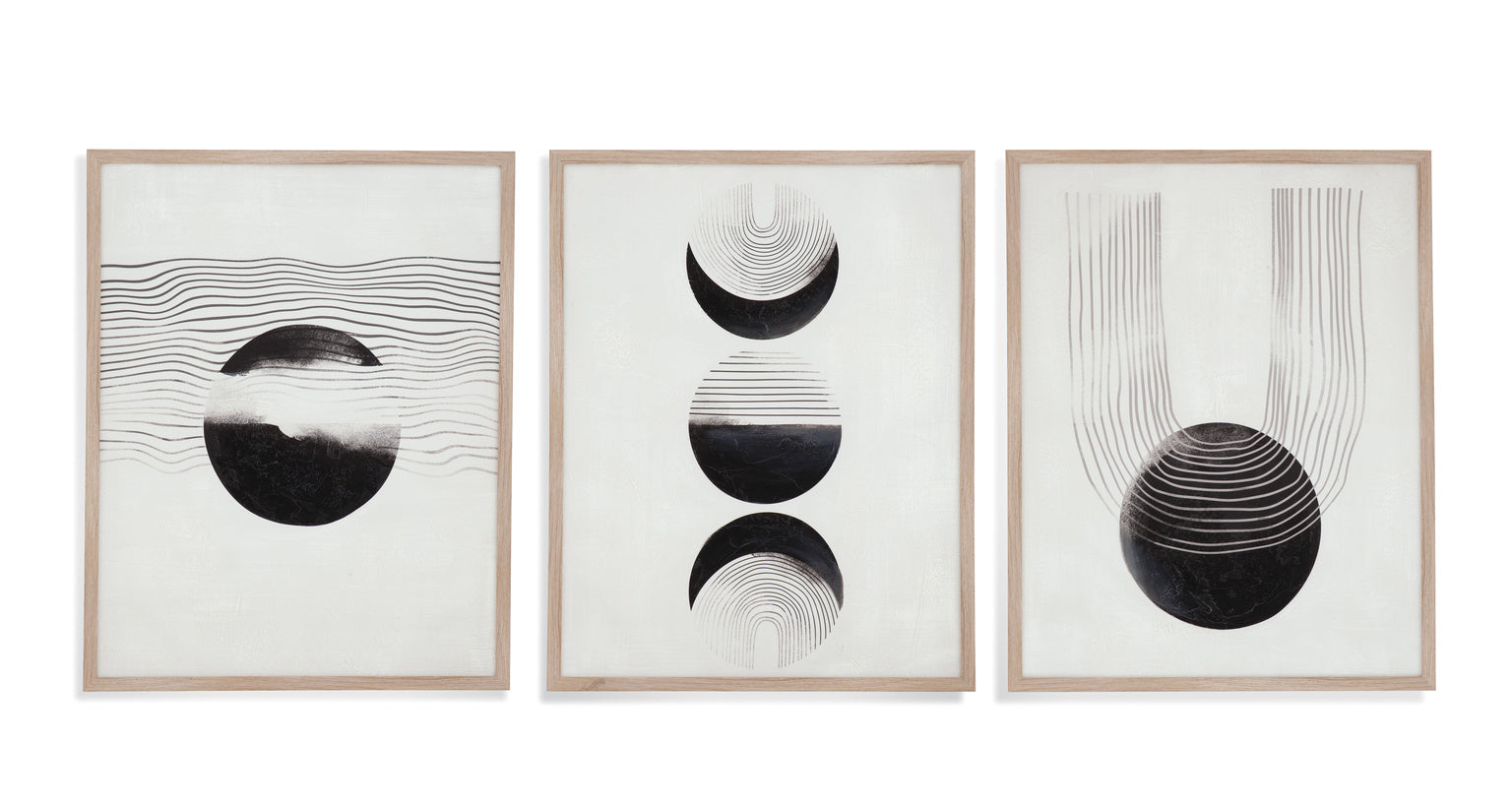 Phases is a set of three abstracts hand painted on canvas with natural wood frames.