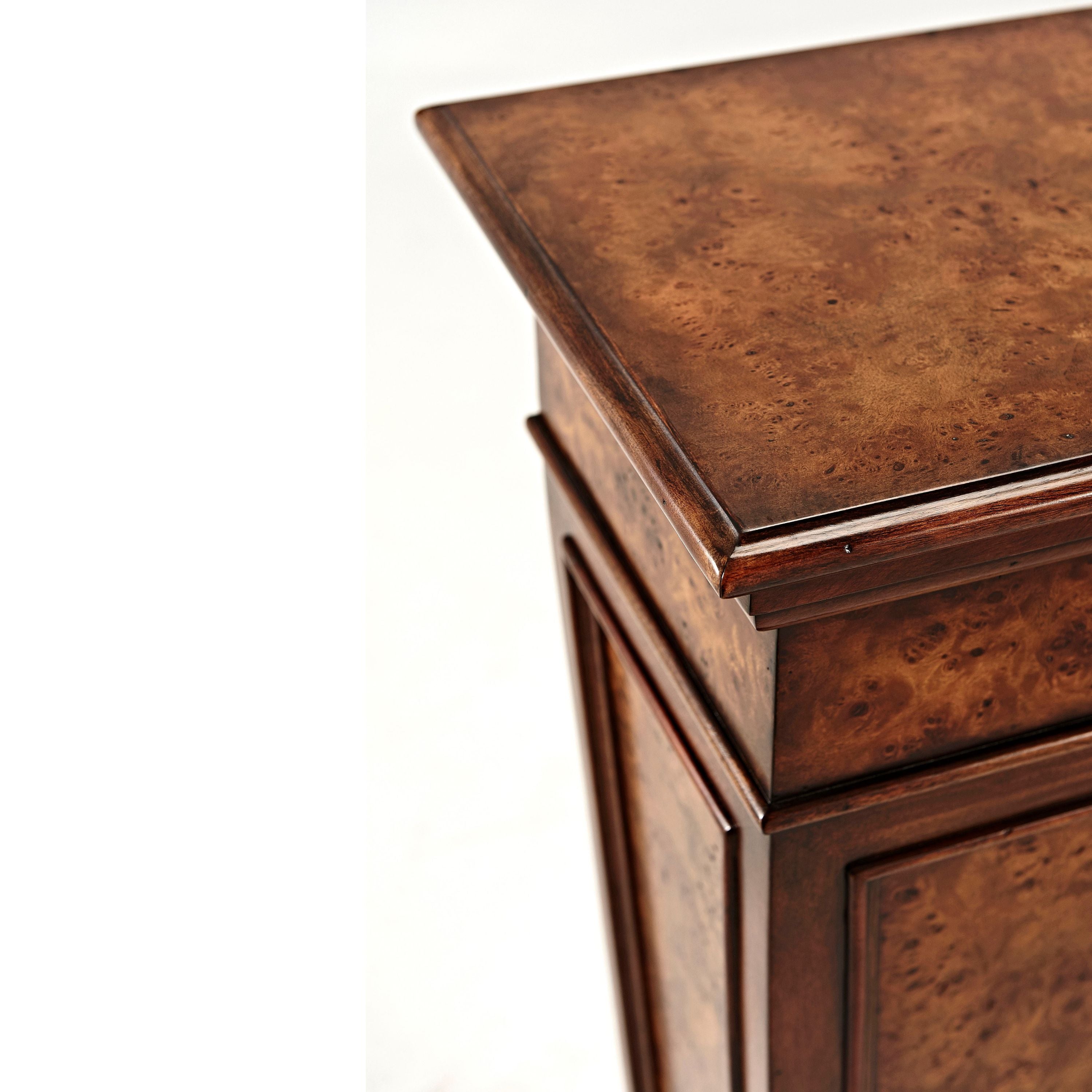 A Classical poplar burl panel tapered pedestal, with a square top and a stepped plinth base. The original Louis XVI.