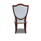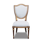 The Elizabeth Shield Back Chair exudes timeless refinement with its sculpted shield-shaped backrest, framed in rich dark wood with gilded accents. Upholstered in a soft pale blue fabric, it blends classical elegance with regal charm. Fluted legs, gold-leaf detailing, and intricate carved motifs enhance its sophistication, making it a distinguished seating choice for dining or accent spaces.