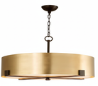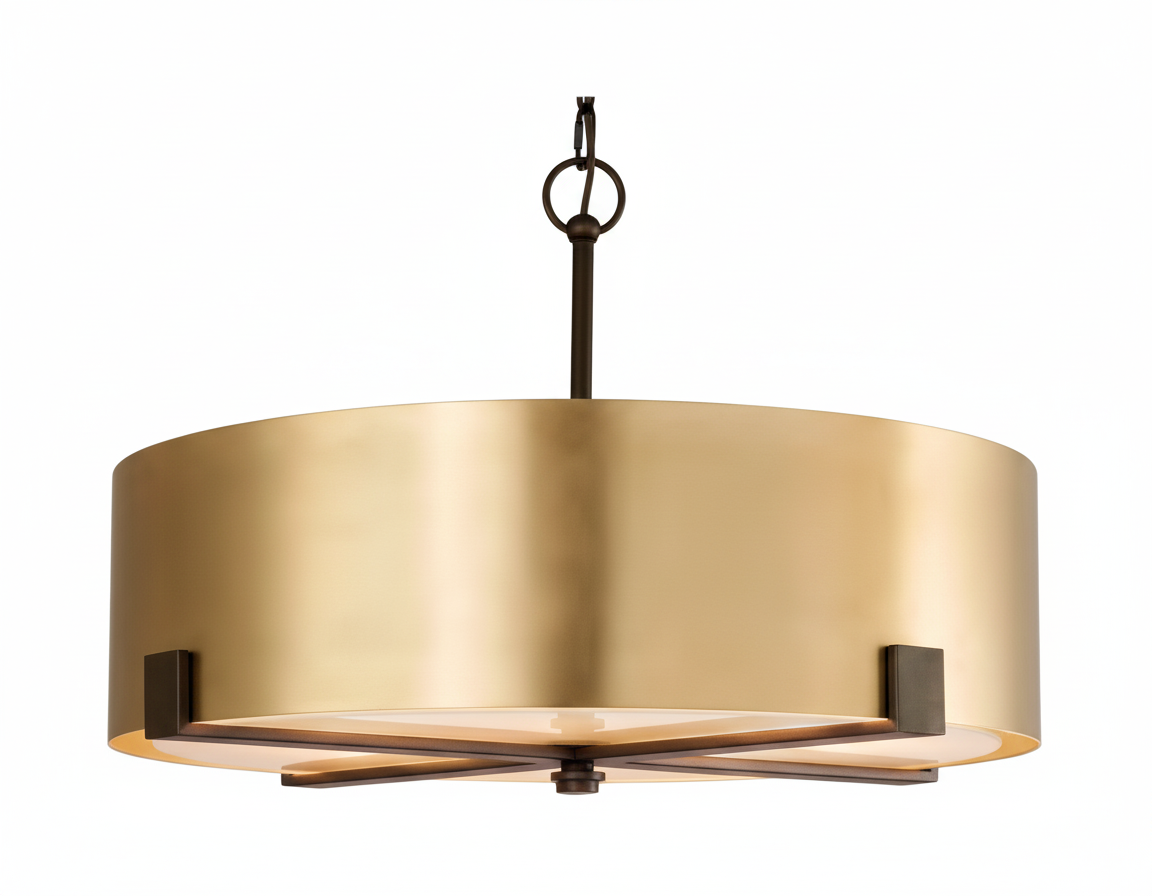 The Modern Empire Drum Pendant embodies understated sophistication with its clean, architectural form. A broad cylindrical shade in brushed brass diffuses a warm, ambient glow, perfectly balanced by dark bronze accents and a sleek suspension rod.