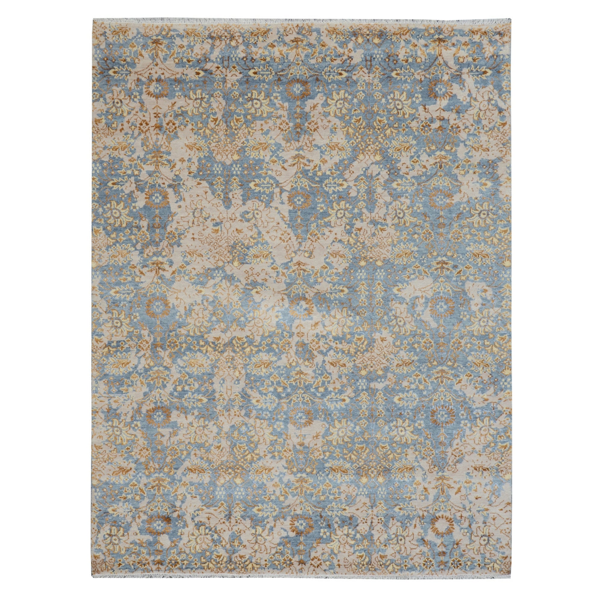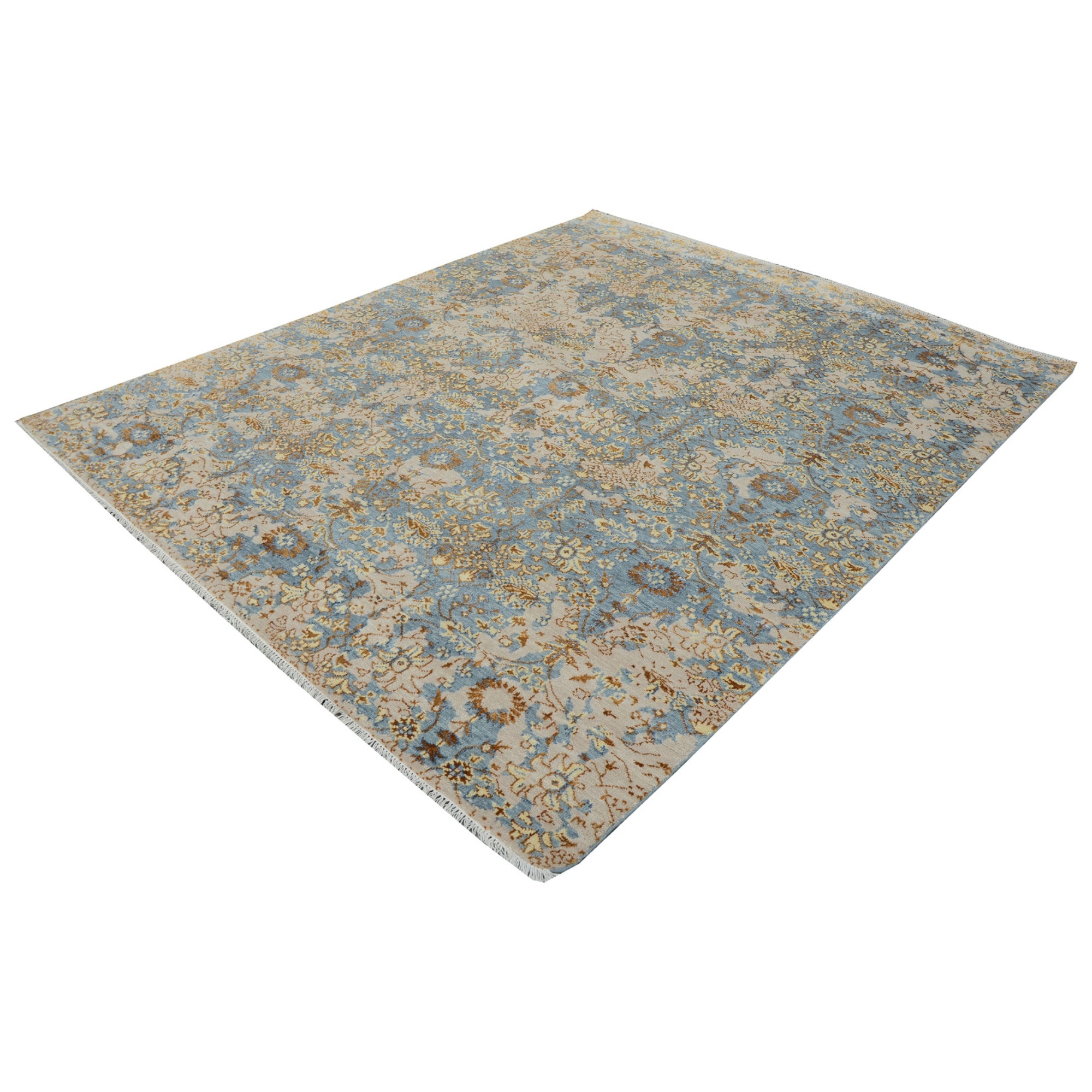 A celebration of heritage and elegance, this hand-knotted carpet features an intricate Isfahan-style floral motif rendered in soft sky blue, ivory, and warm ochre tones. Meticulously woven with 80% hand-spun wool and 20% natural silk, it offers a refined texture and a luminous sheen. The timeless design and subtle palette bring sophistication and serene charm to both classic and transitional interiors.