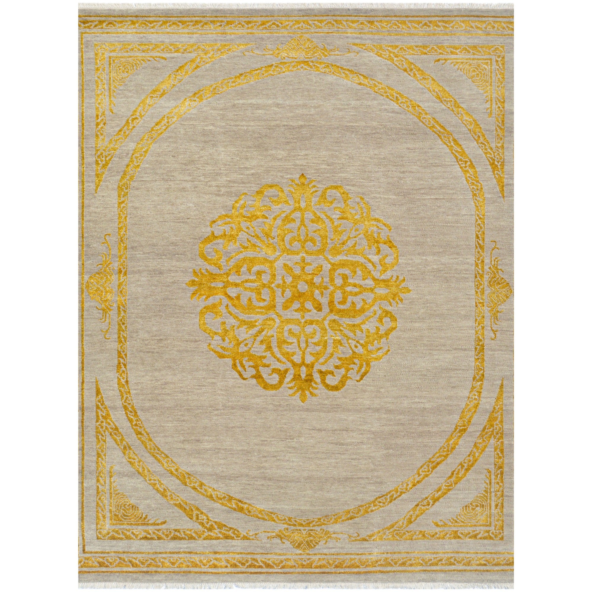 The Gilded Orbit Rug is a sophisticated hand-knotted creation, crafted from hand-spun wool and natural silk. An elegant circular medallion anchors the design, framed by graceful arcs and refined borders rendered in luminous antique gold against a soft ivory ground. The subtle contrast between matte wool and shimmering silk lends depth, balance, and a quiet radiance—making this rug a striking yet timeless statement for refined interiors.