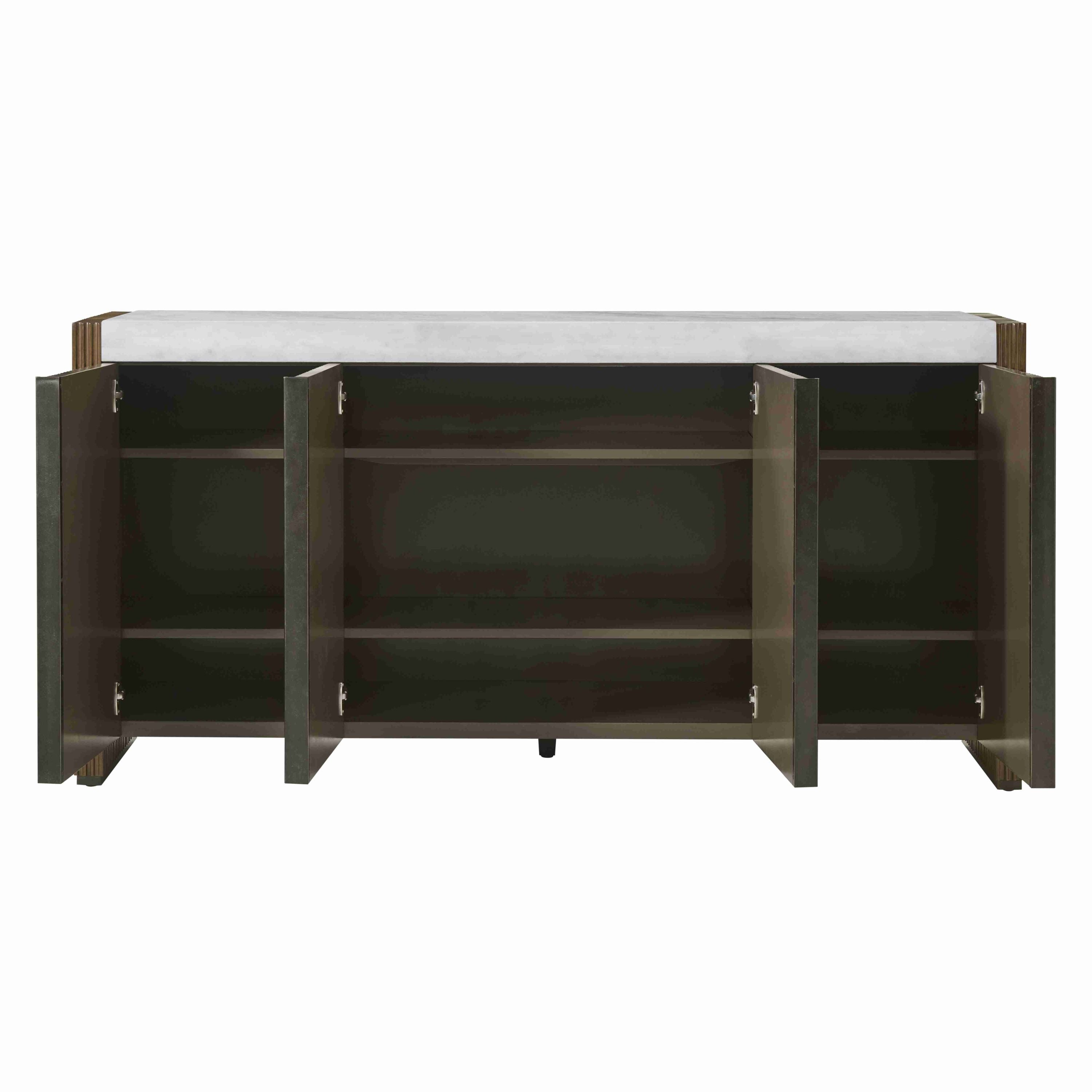 The Riva Media Cabinet, featuring a rhythmic reeded pattern in our Gelato finish, marble top and brass Romulus finished hardware, creates the perfect combination of organic sophistication and contemporary style.