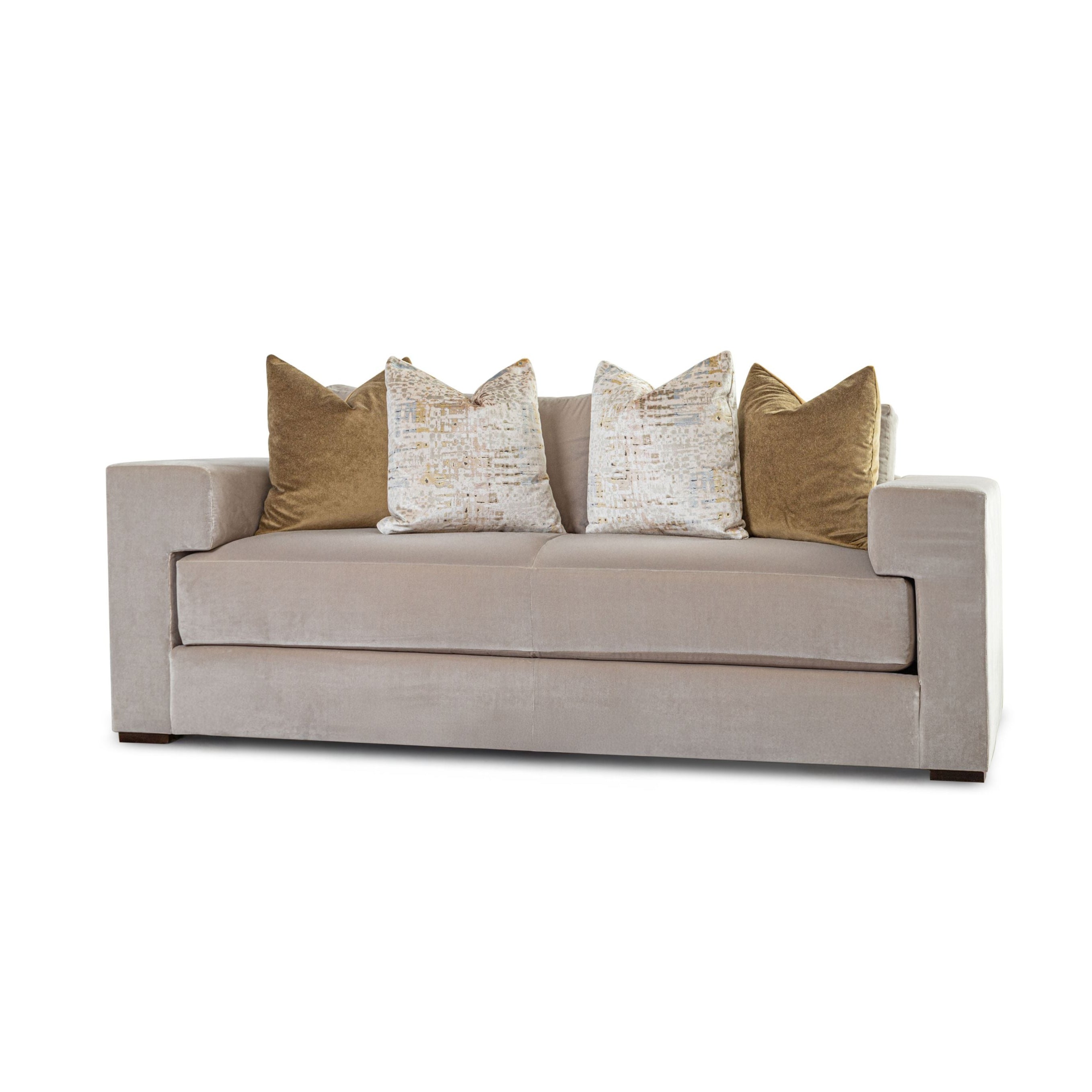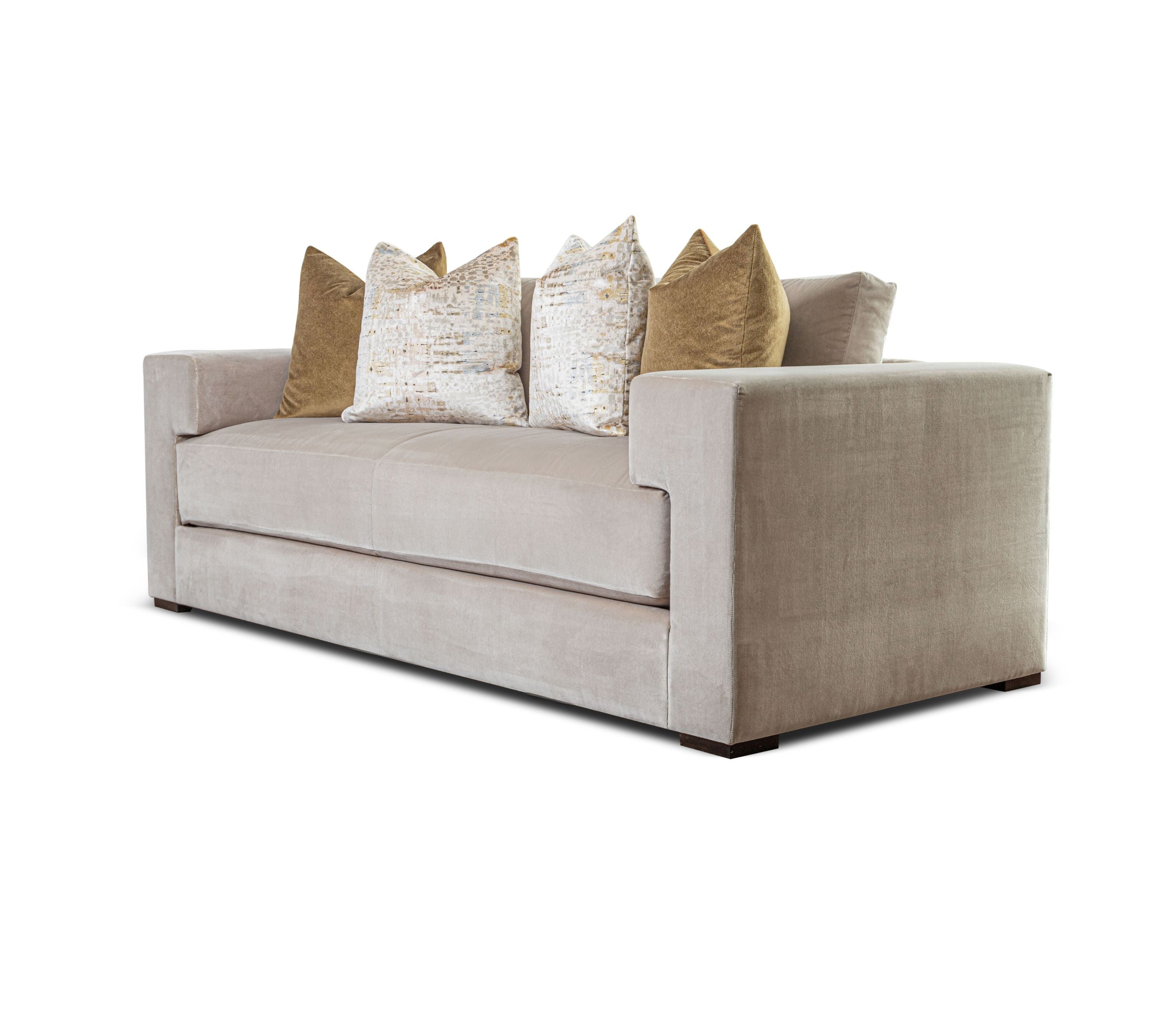 Fully upholstered sofa with block feet. Featuring a wrap-around arm with “captured” loose-boxed seat cushions and back pillows.