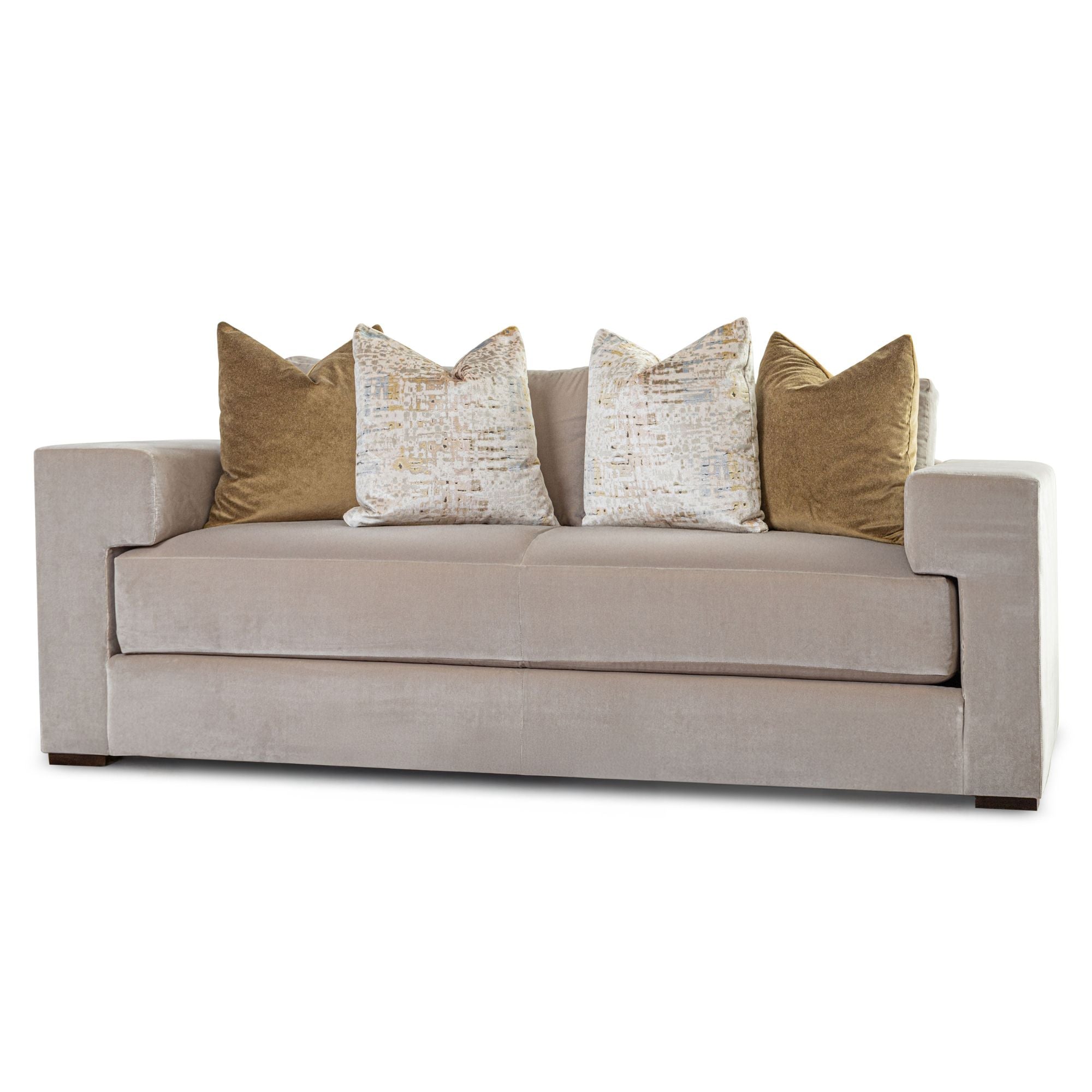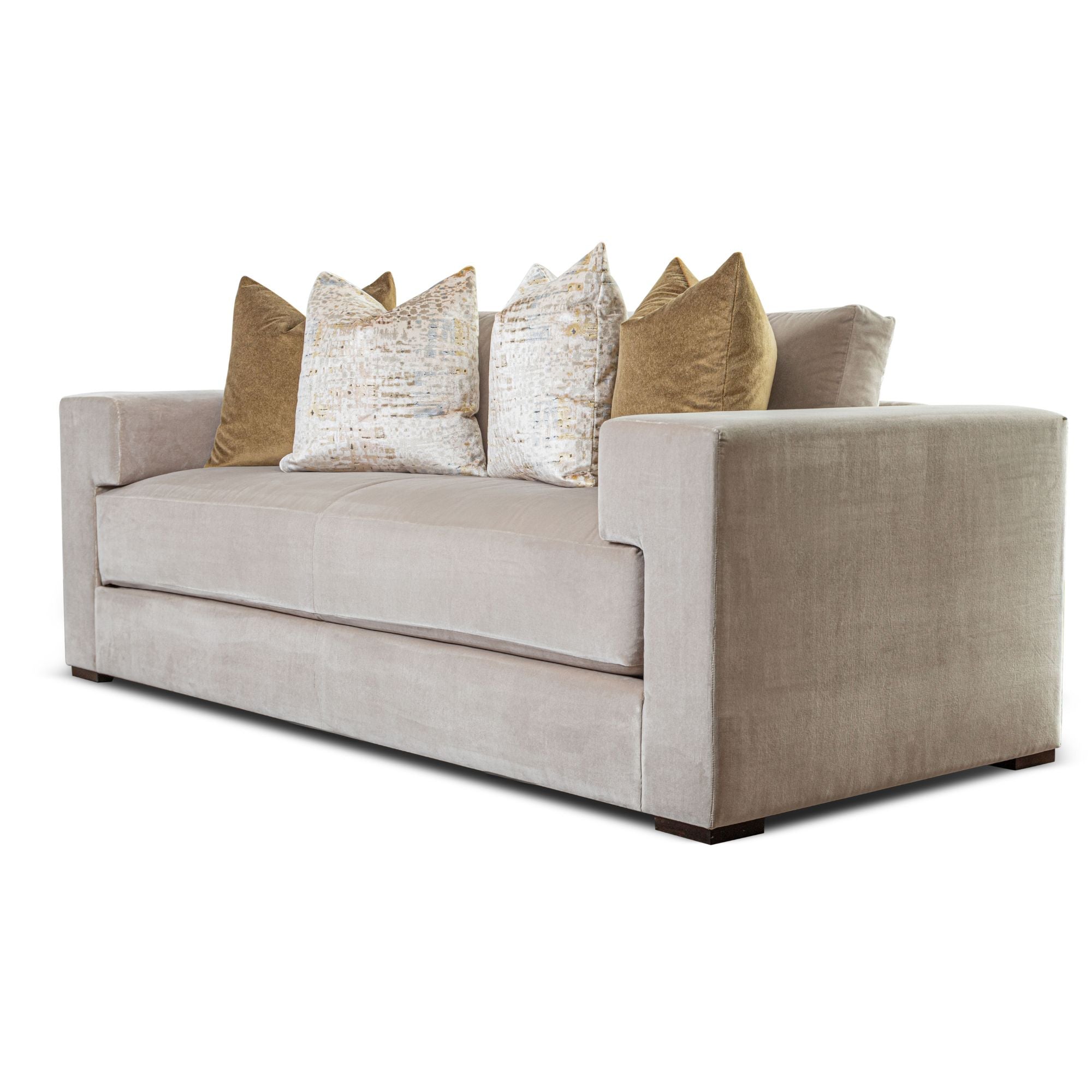 Fully upholstered sofa with block feet. Featuring a wrap-around arm with captured loose-boxed seat cushions and back pillows.