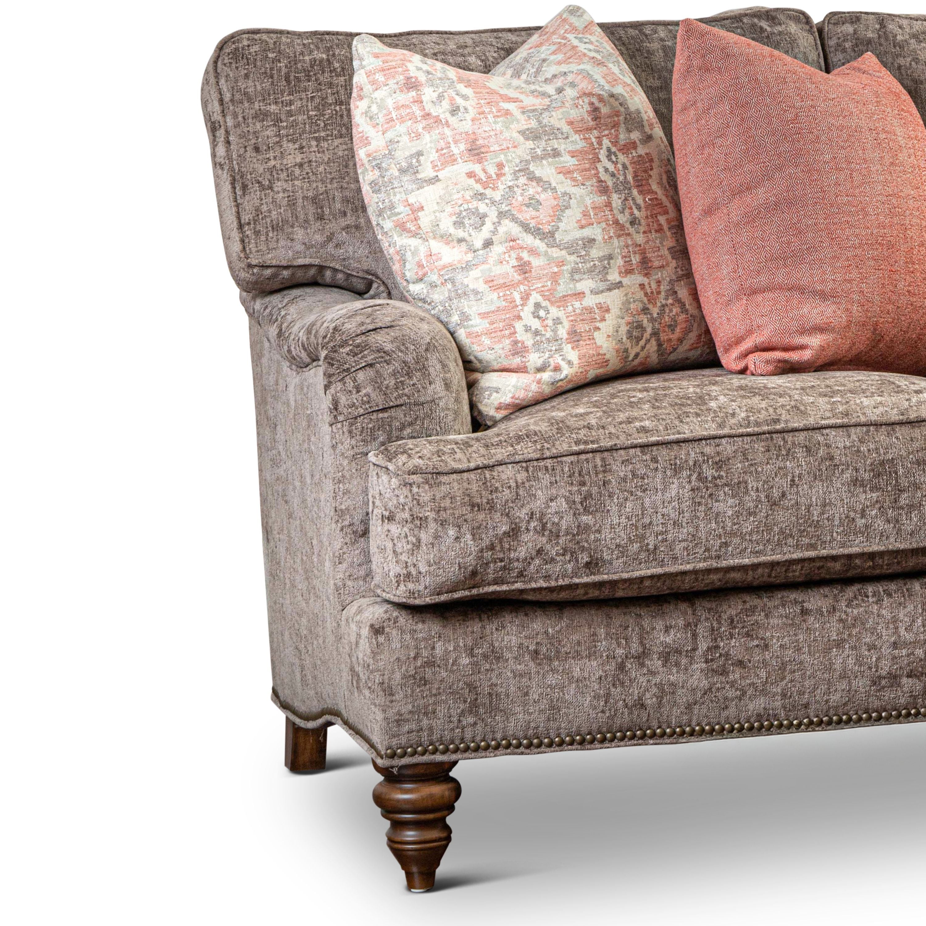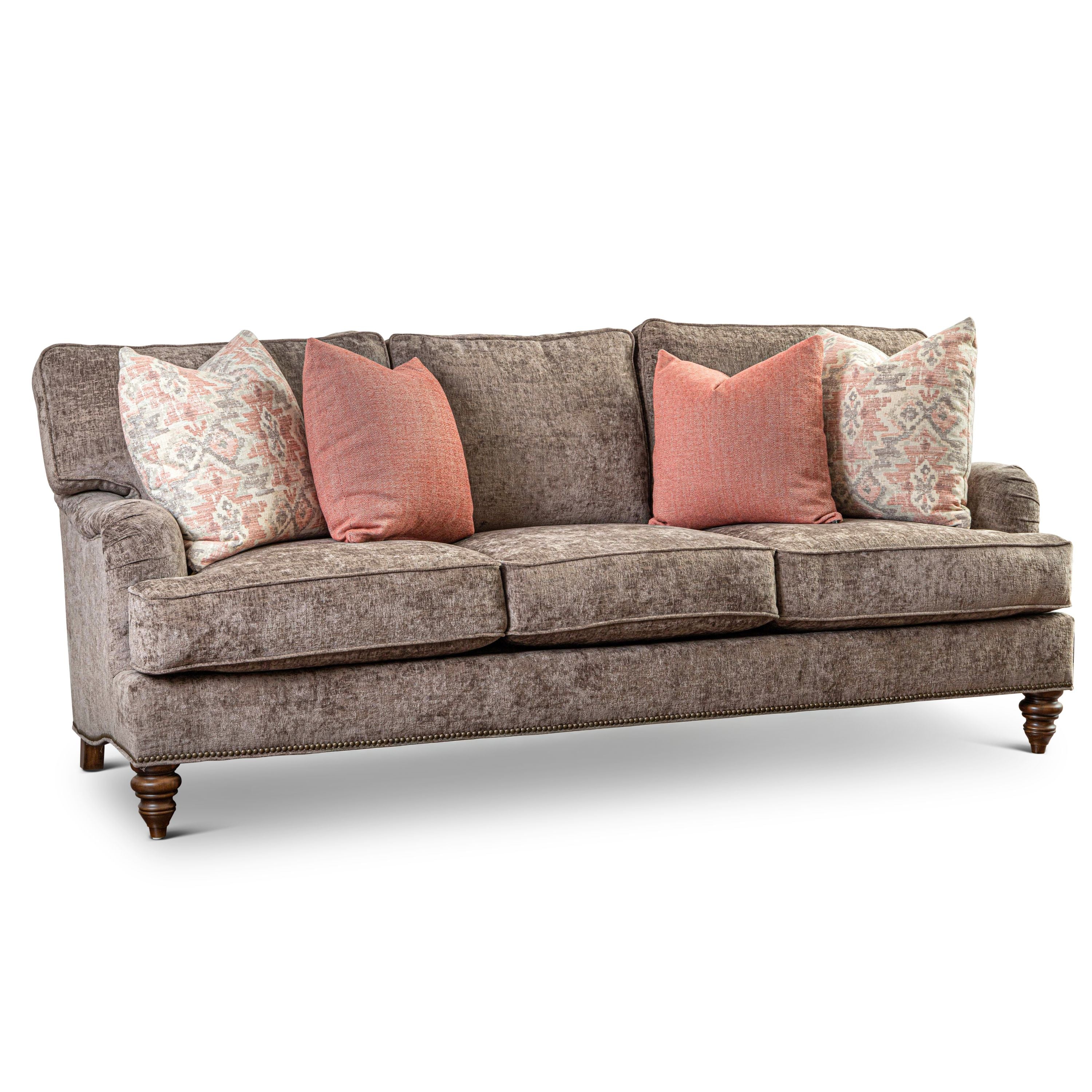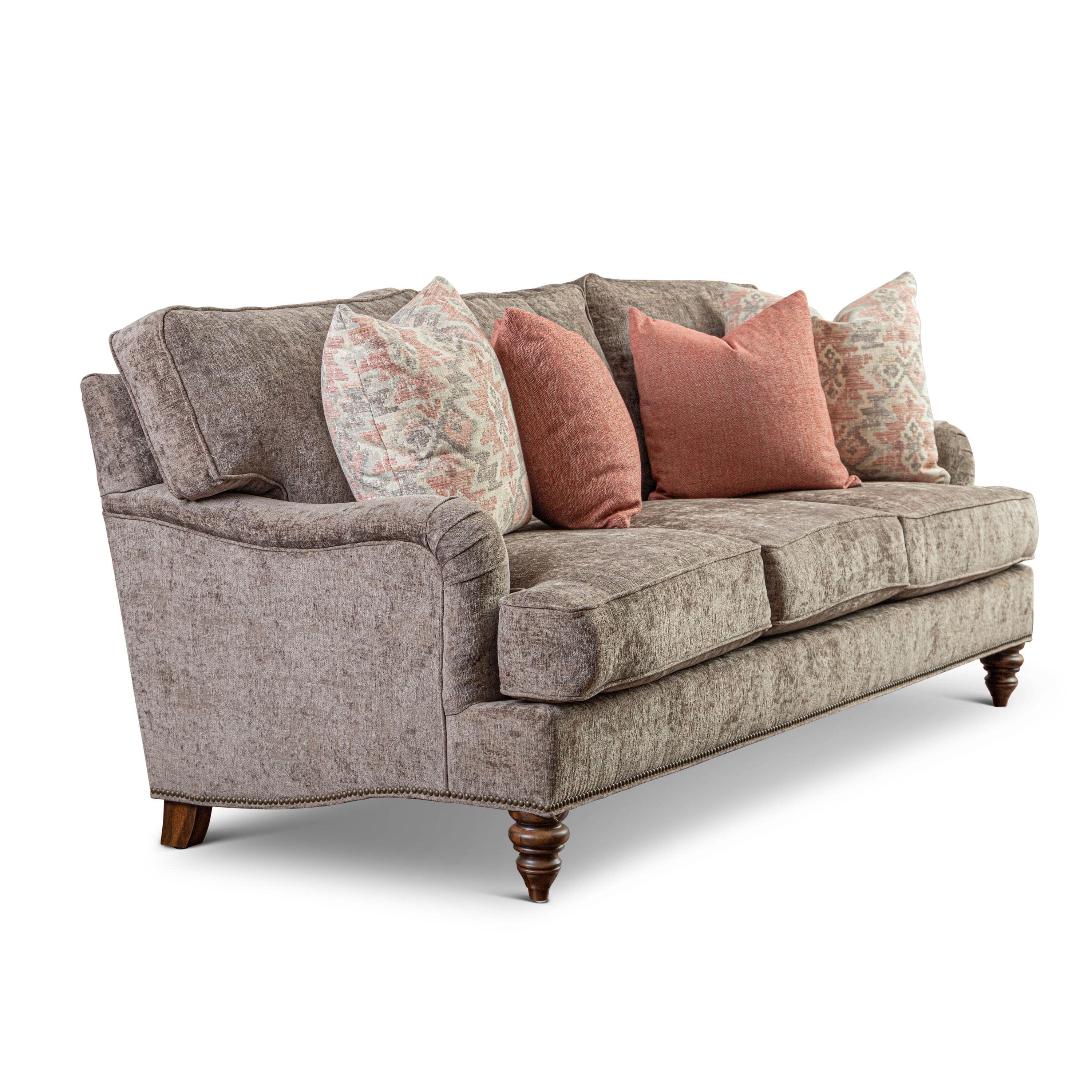 The Upstate 3 Seater Sofa blends traditional charm with everyday comfort. Upholstered in a soft, textured fabric with a warm brown tone, this sofa features classic rolled arms, hand-applied nailhead trim, and beautifully turned wooden legs. Styled with plush back cushions and patterned accent pillows in blush and ivory tones, it delivers a cozy yet refined look.