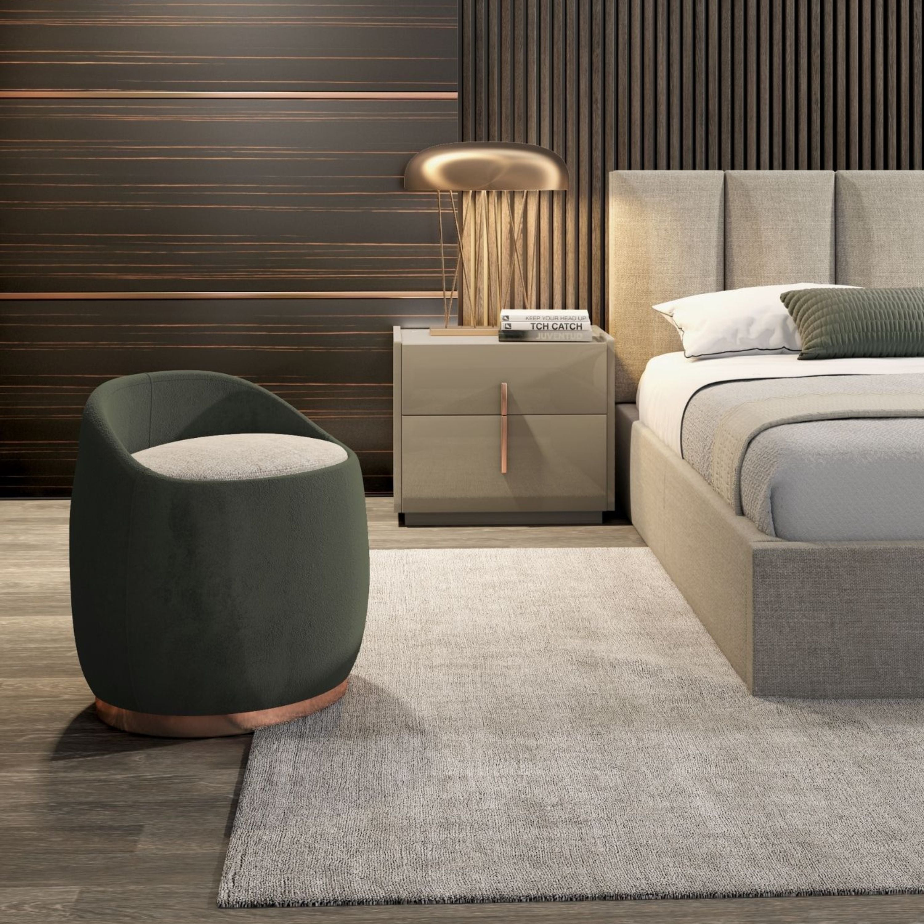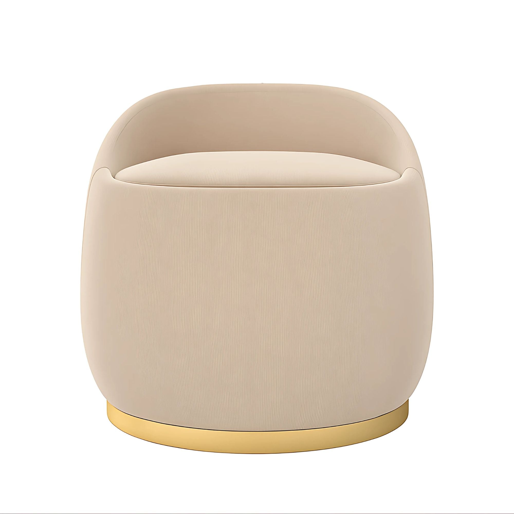 Batha Puff upholstered in fabric with brass finish baseboard, it is a piece with a modern and elegant look.