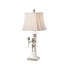 A finely cast table lamp, the finely cast rubbed nickel-brass Putti holding aloft burning torches as candleholders, raised on a white marble pedestal base, surmounted by a hand sewn fabric shade and pinecone finial.