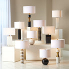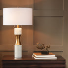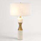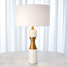 Similar to a corset, The Marble Cinch Lamp has a brass plated steel curved center between two layers of white marble. Holds two A bulbs, two pulls chains and a brass finial. Hardback fabric shade.