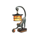 Verdigris Bronze Patina Monkey Lamp, Leather Inlaid Book Design, Young and Black Penshell Shade with Mother of Pearl and Brass Accents.