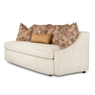 An upholstered sofa, the gently curved back with downswept low arms enclosing a shaped loose bench cushion seat with quadruple loose pillow back, on an upholstered base.