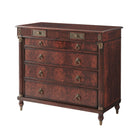 The chest of drawers is made of mahogany. Two drawers with fluted fronts and embossed bronze overlays are built into the frieze. Below are four drawers of different sizes framed by Corinthian columns with brass capitals and bases. The round legs end in brass tips. The design is inspired by the original in the Louis XVI style.