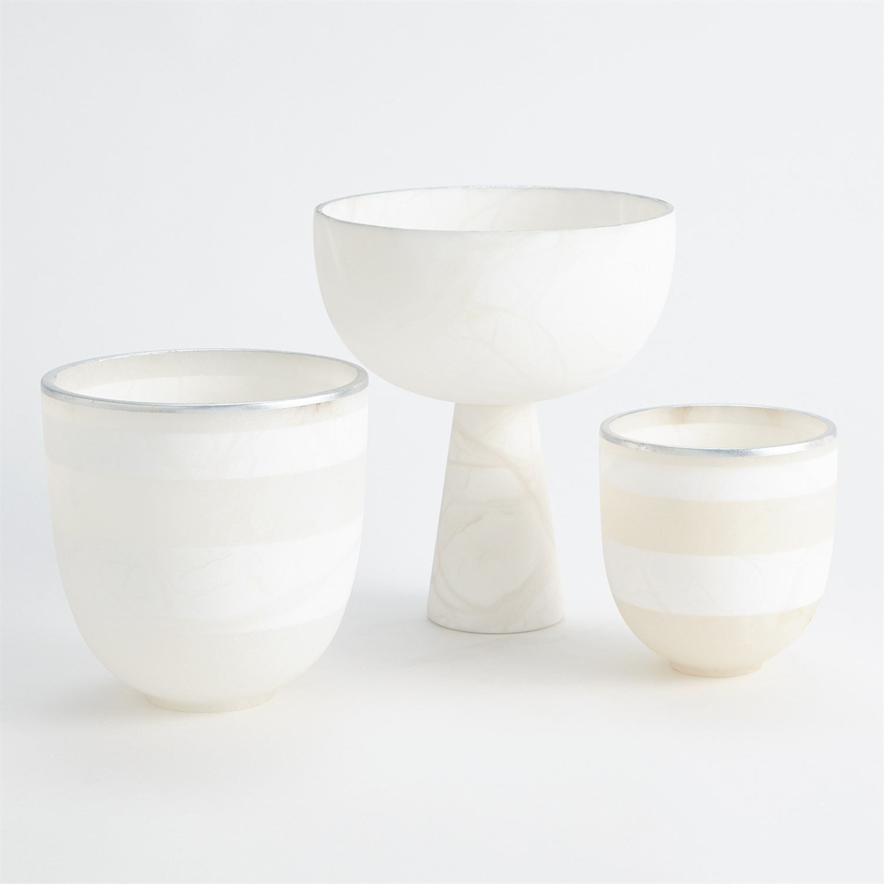 The Footed Alabaster Bowl is made of alternating blocks of Italian alabaster with silver leaf painted detail. As alabaster is a natural product, please be aware that there will always be variations in veining and color.