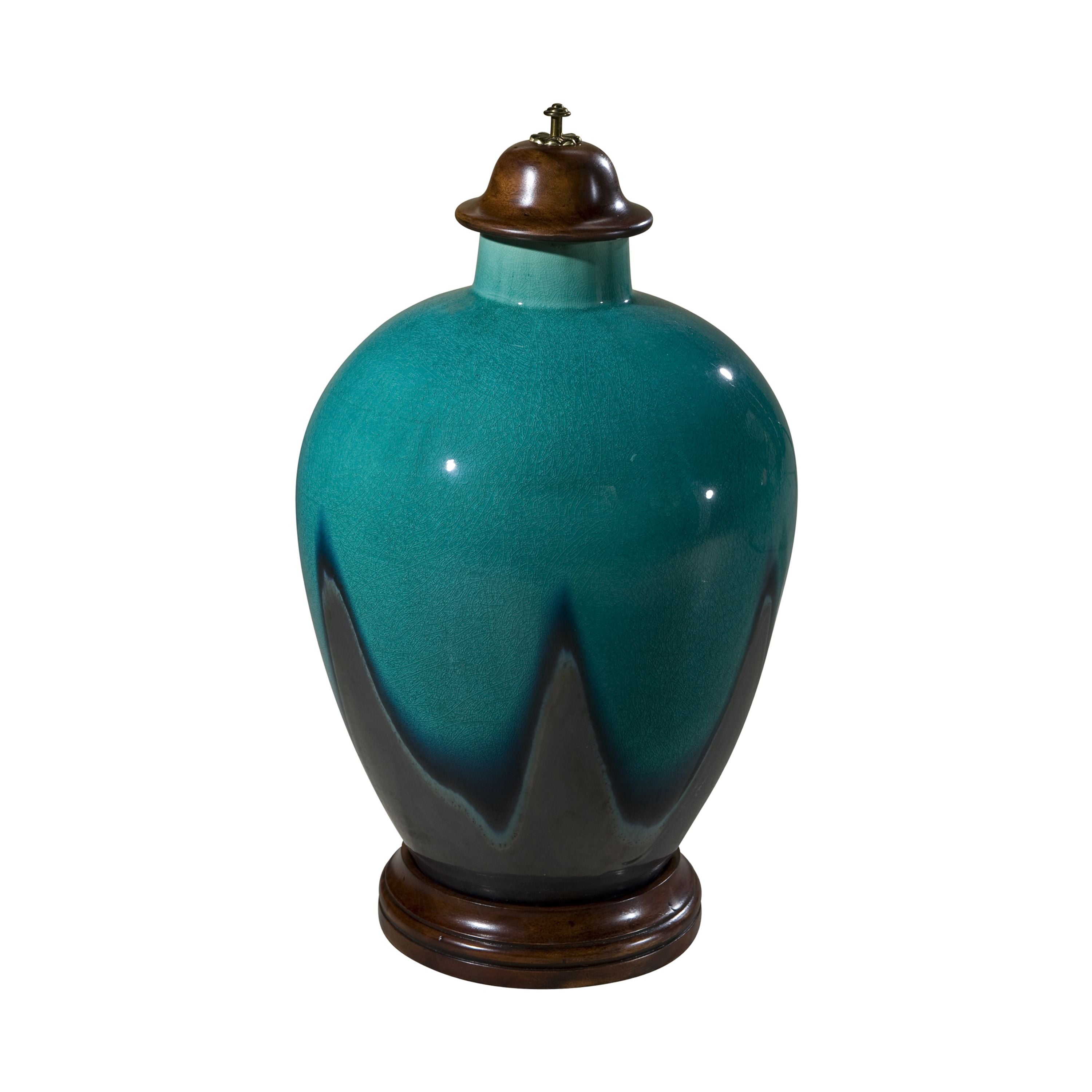 A turquoise drip glaze Studio vase, with a turned lid and base. The original Victorian.
