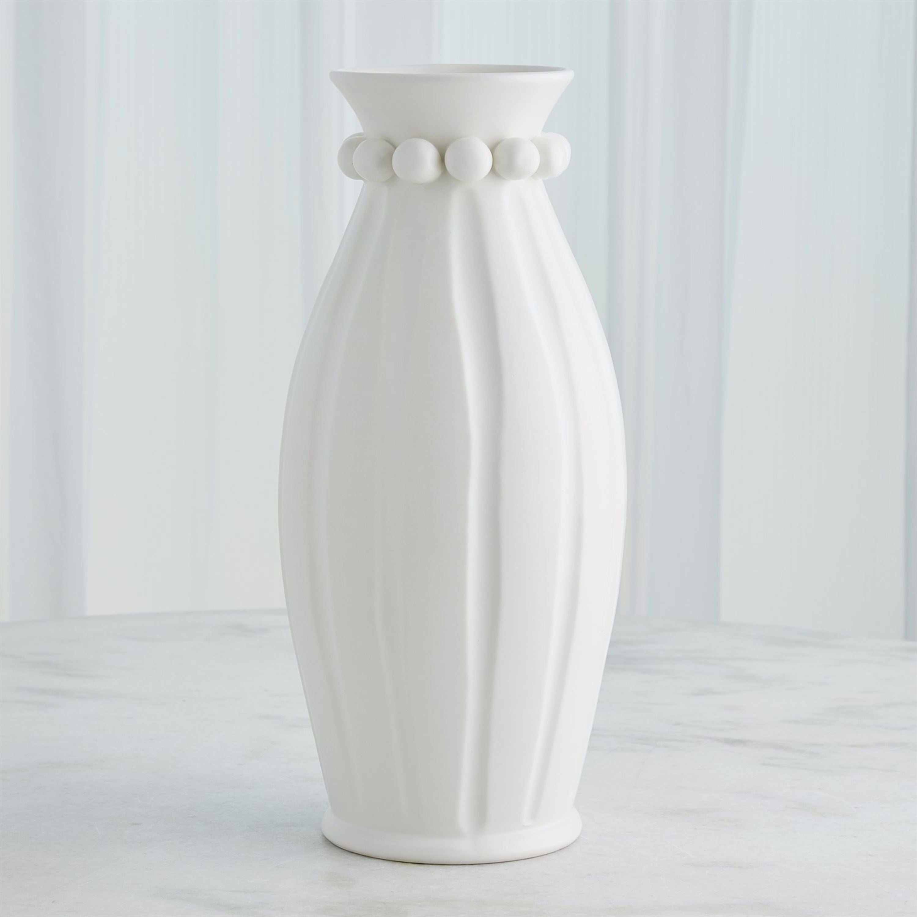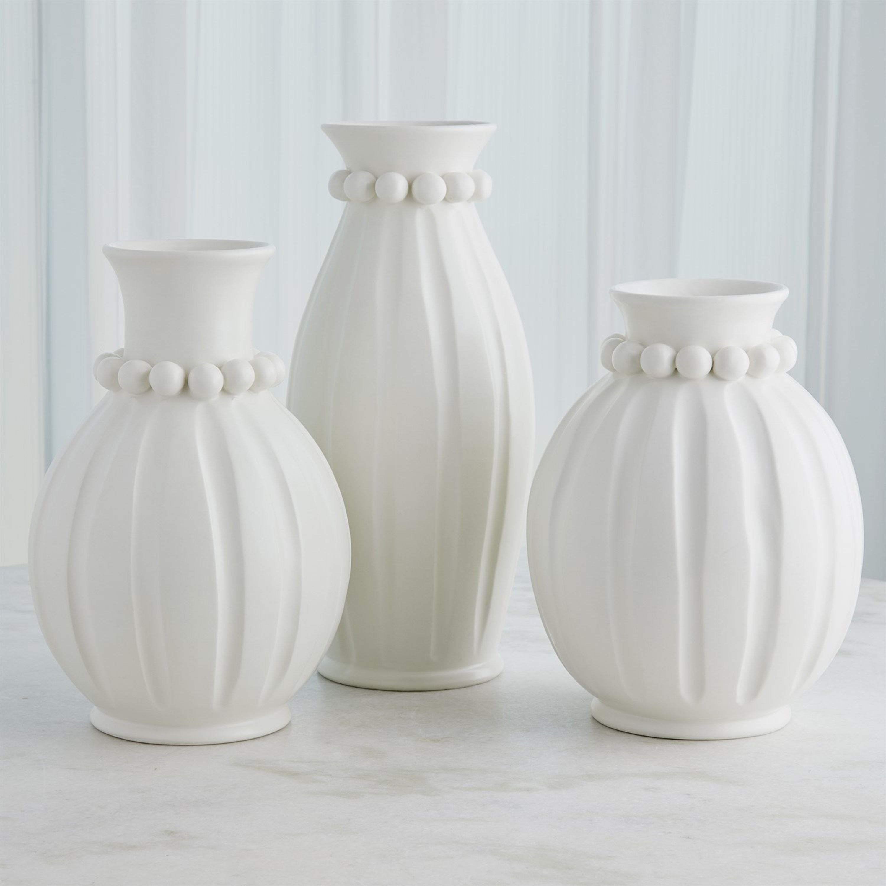 The Pearl Vases are a masterpiece of handcraftsmanship. Italian artisans embark on a meticulous process, hand-forming and handshaping cut pieces of wet clay to bring these vases to life. Using a mold, they meticulously create pearl details, hand-applying each one individually all the way around the vase. A special tool is then employed to create fluted indentations, adding to the intricate design of these exquisite pieces.