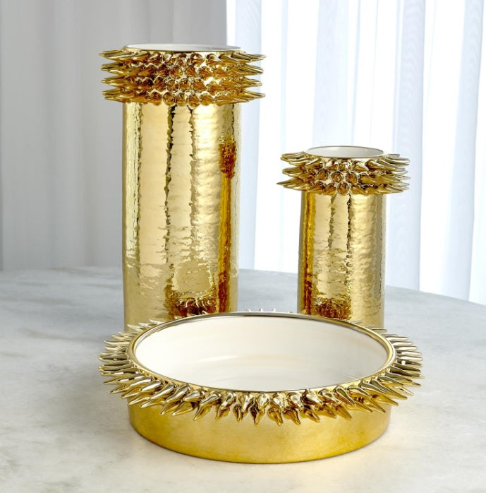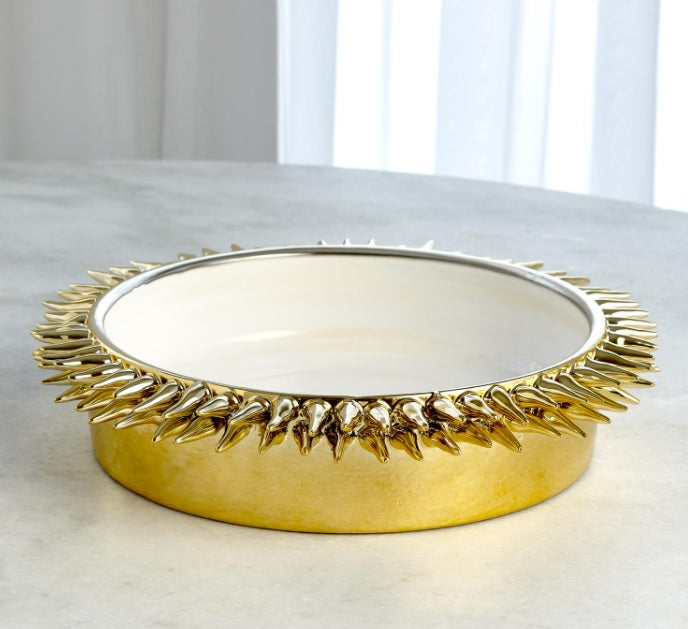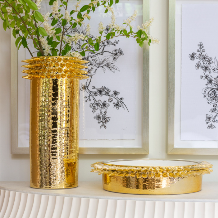 Ashley loves to mix both modern and edgy elements into the designs she creates and our Spike Collection is a perfect example. Made in Italy, by our master ceramicist, each piece is adorned with hand-formed spikes. Glazed in either Bisque White or electroplated brass.