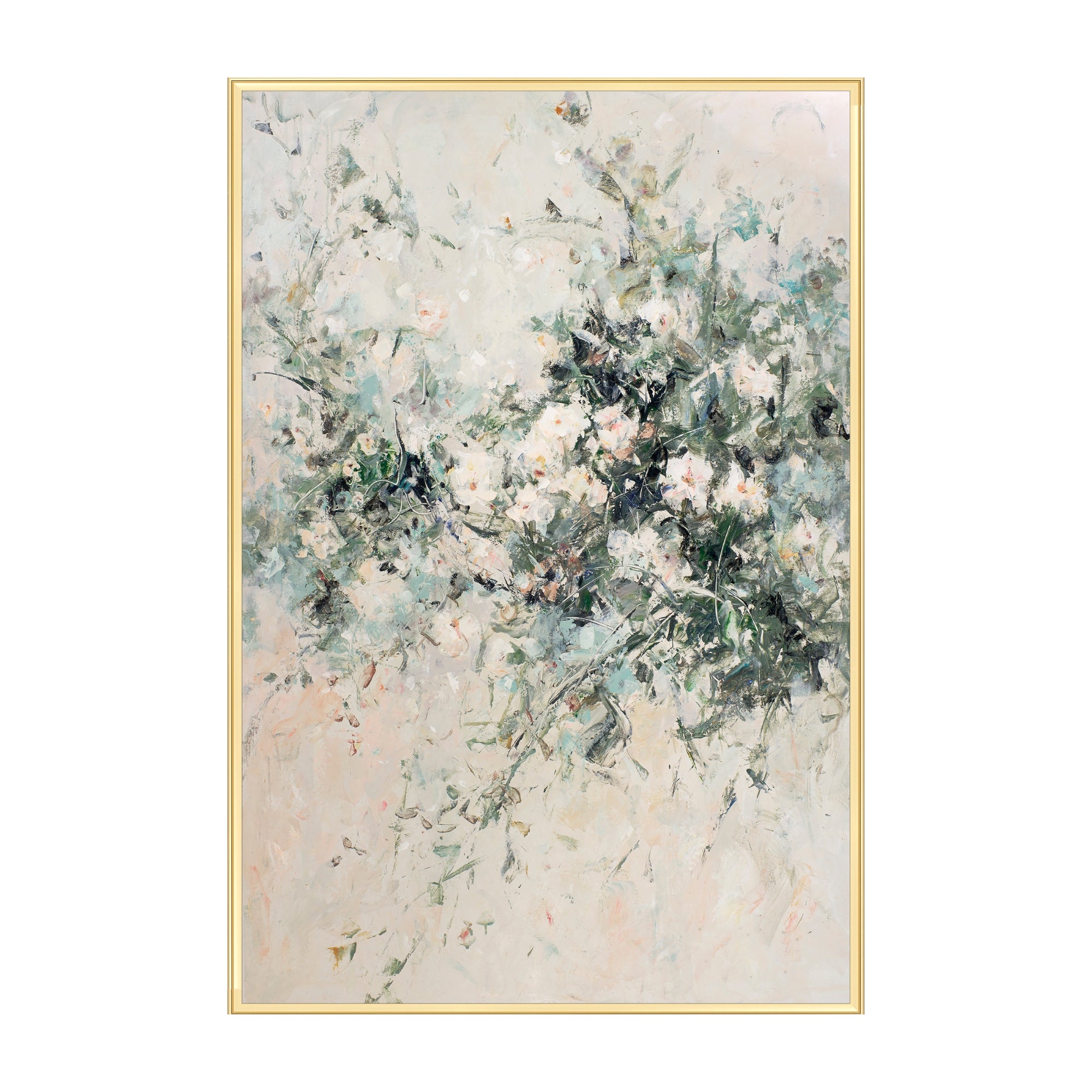 An airy abstract floral composition where soft whites, blush tones, and muted greens intertwine in delicate, impressionistic strokes. The gentle layering and fluid movement evoke the fleeting beauty of blossoms swaying in a light spring breeze.