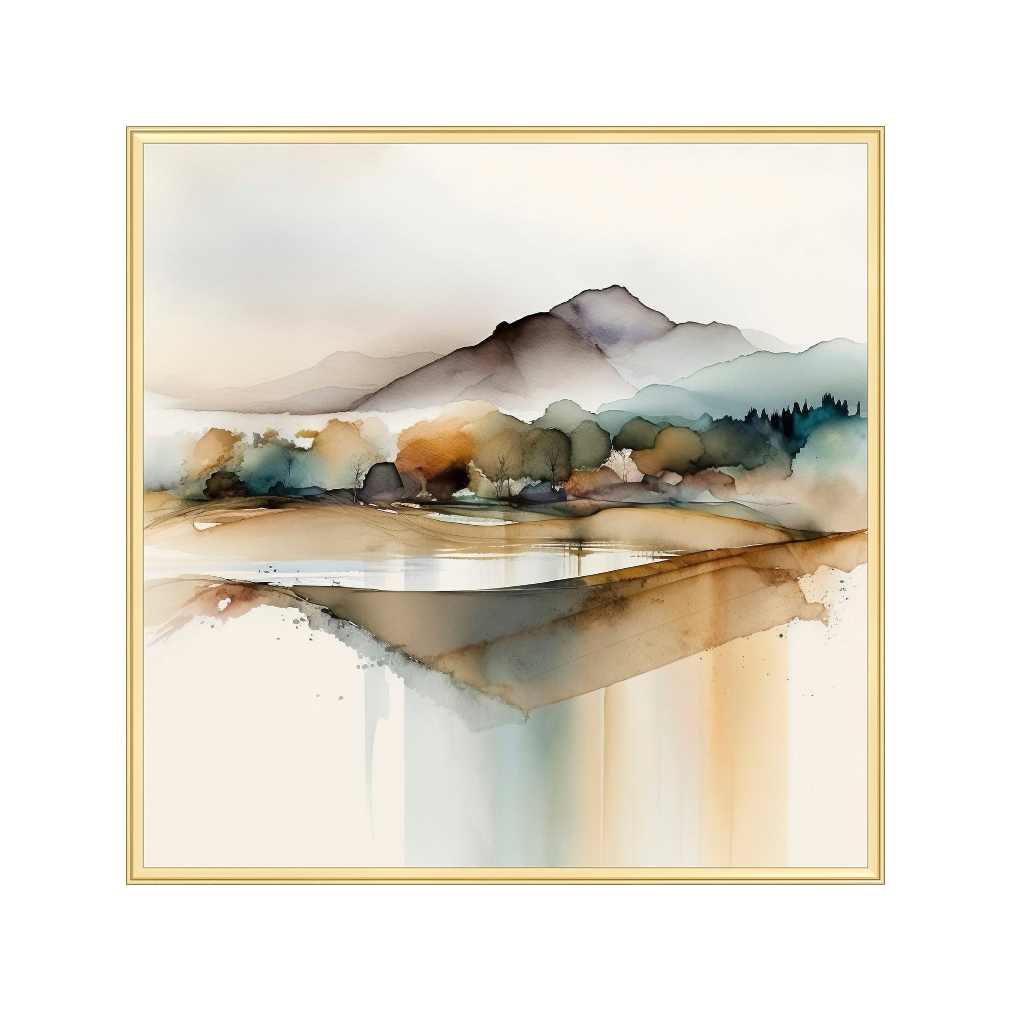A serene watercolor-inspired landscape capturing soft mountain silhouettes, autumn-hued trees, and a tranquil river. Gentle washes of earthy browns, cool blues, and muted greens blend seamlessly, evoking a peaceful morning mist over a quiet valley.
