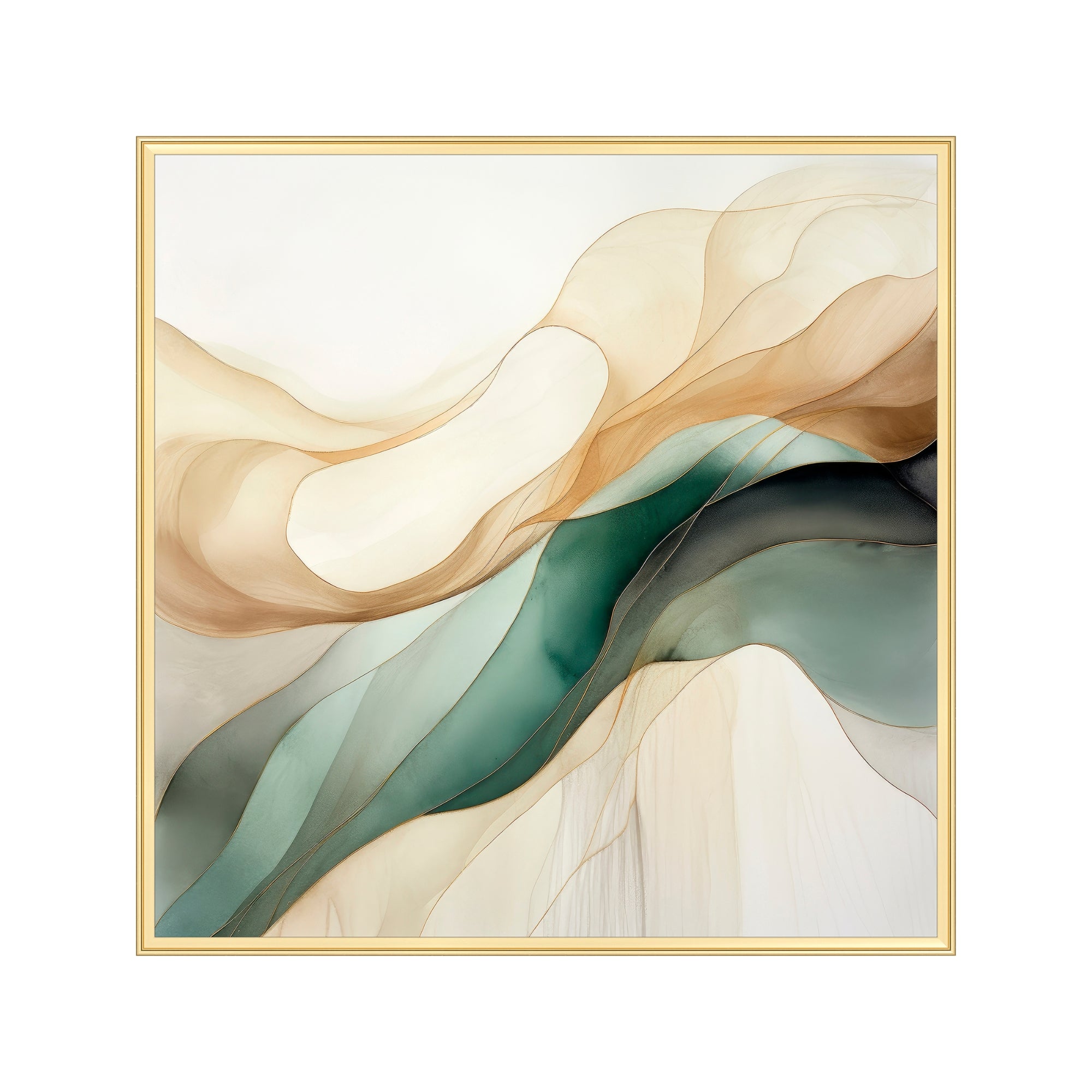 An elegant abstract artwork flowing with soft, translucent layers of sand, cream, and deep emerald tones. The graceful curves and harmonious color palette evoke the gentle movement of wind over dunes and water, creating a sense of calm and balance.
