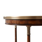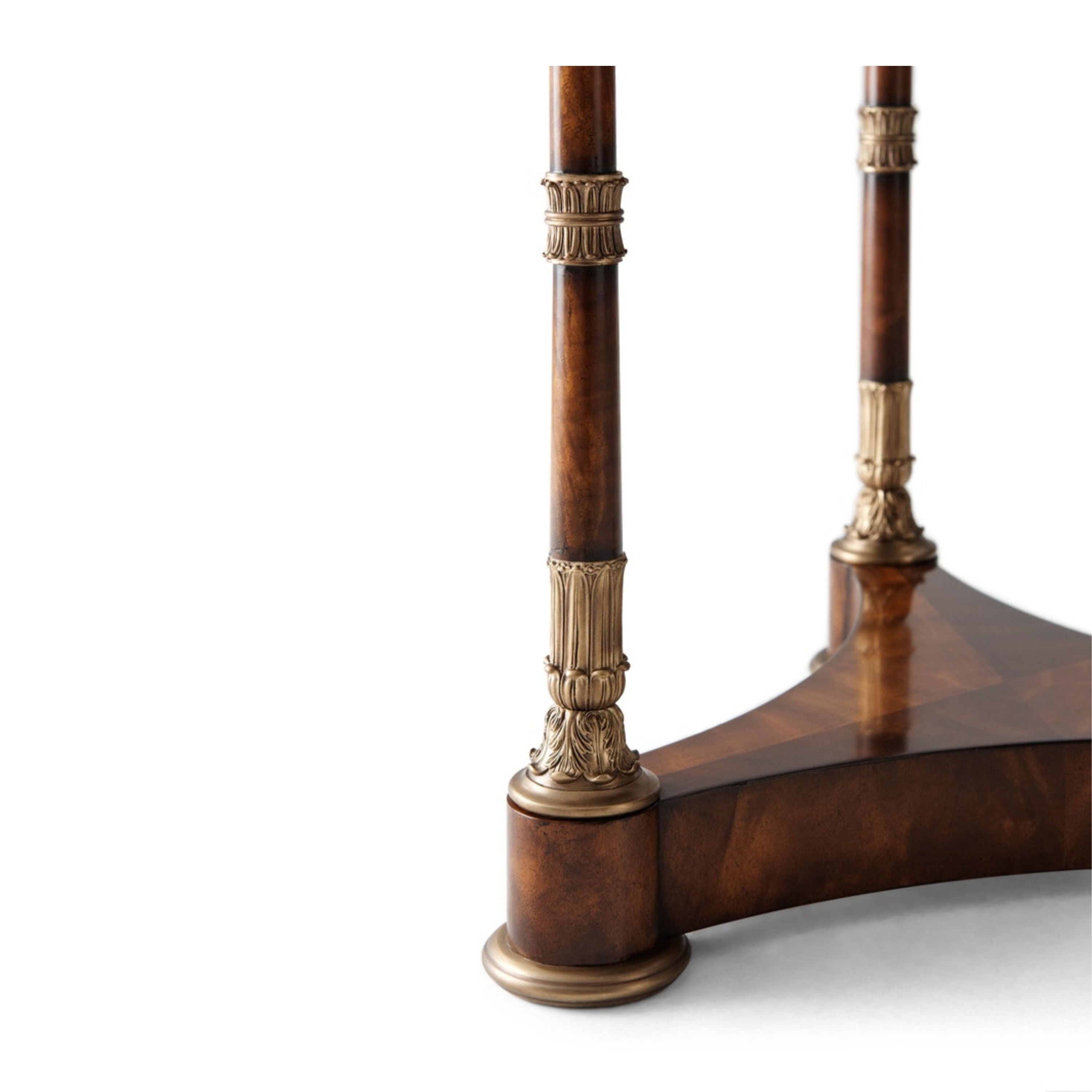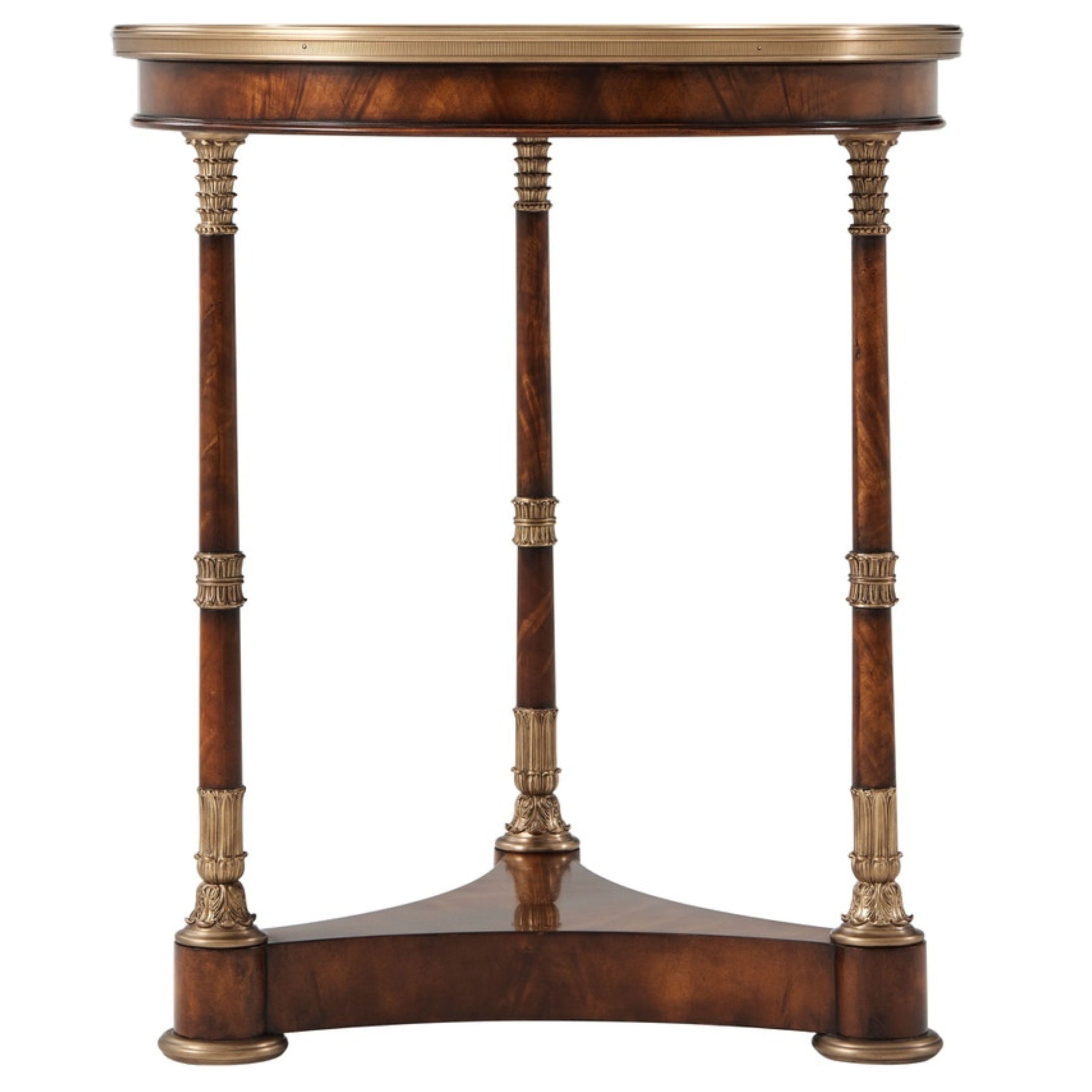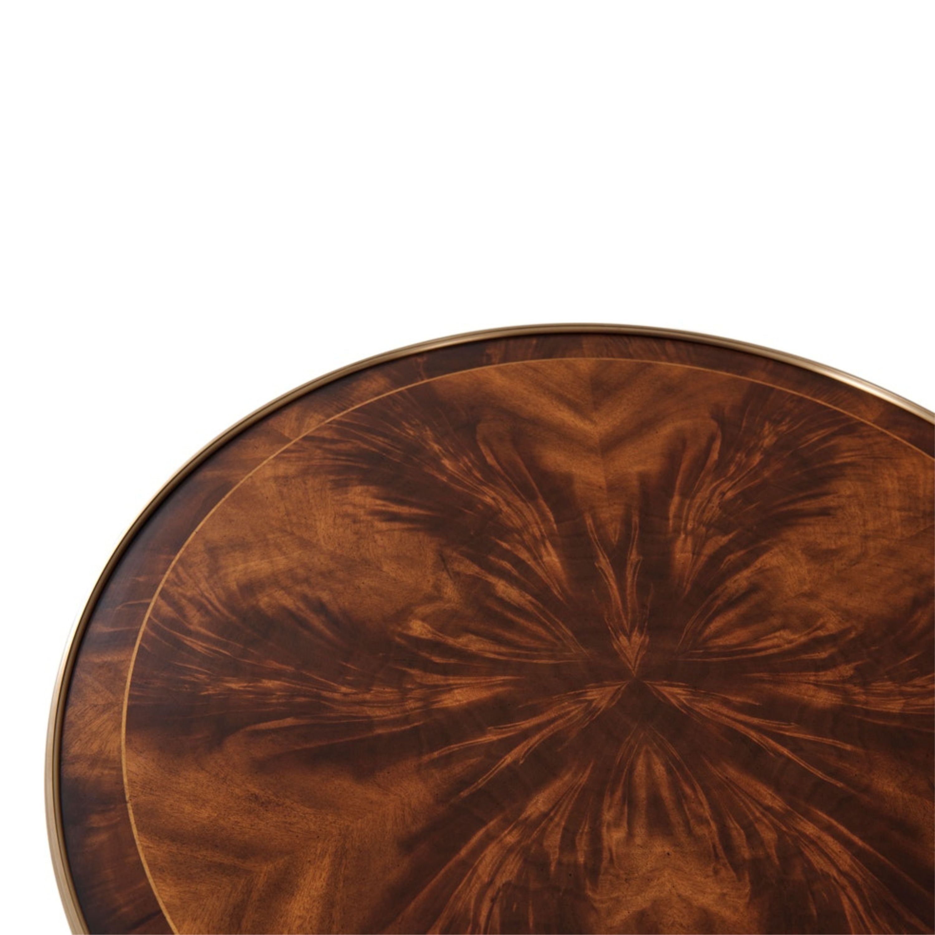 A mahogany and flame veneered lamp table, the circular brass-bound and crossbanded top above three finely brass-mounted veneered column legs, on a concave sided trefoil base raised on brass disc feet.