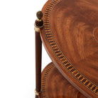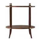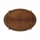 A fine flame Cerejeira veneered, Morado and Sycamore parquetry banded side table, the oval top and undertier with fine double stringing centered by a walnut burl oval, on reeded column supports with Old English finish brass accents and finials, on reeded splayed legs.