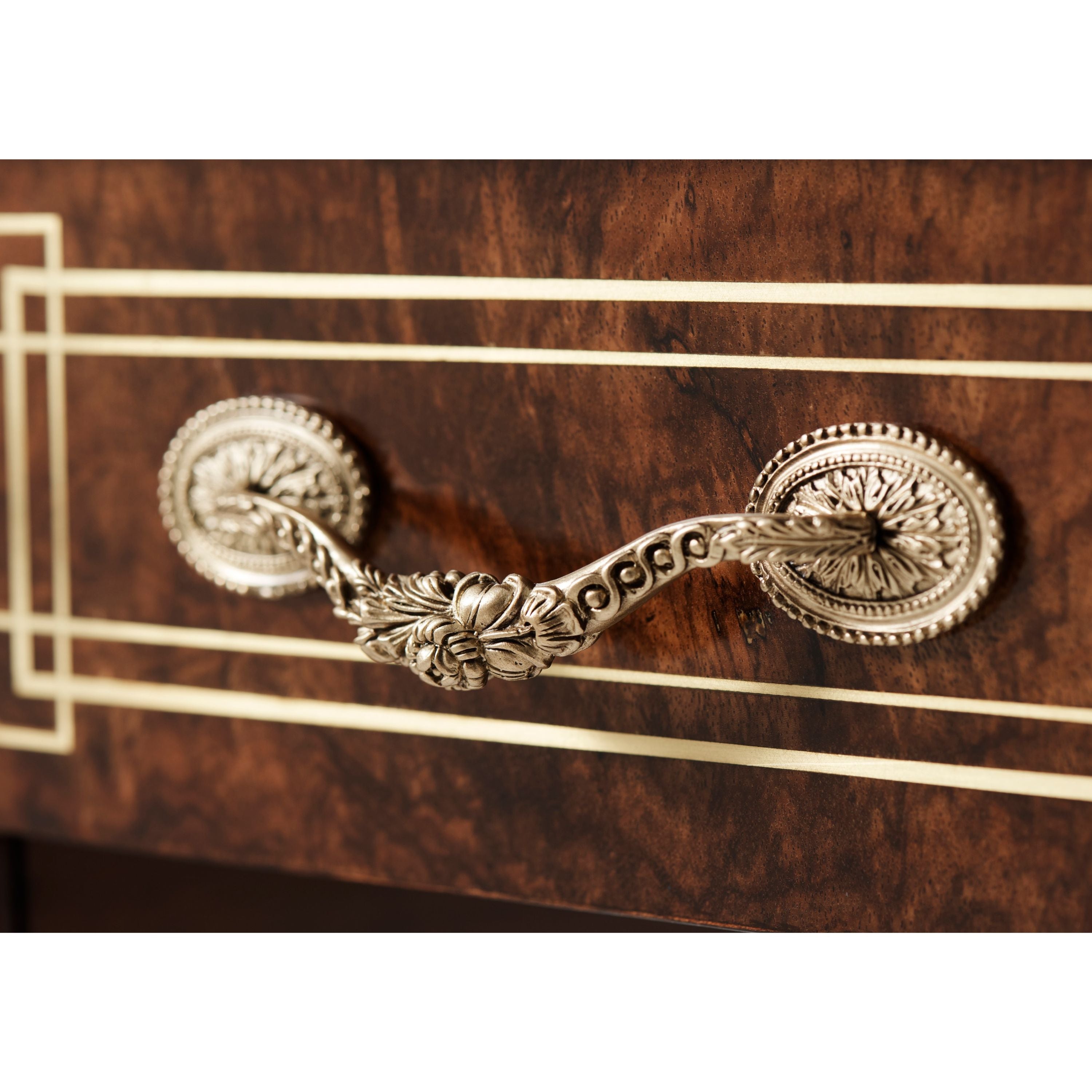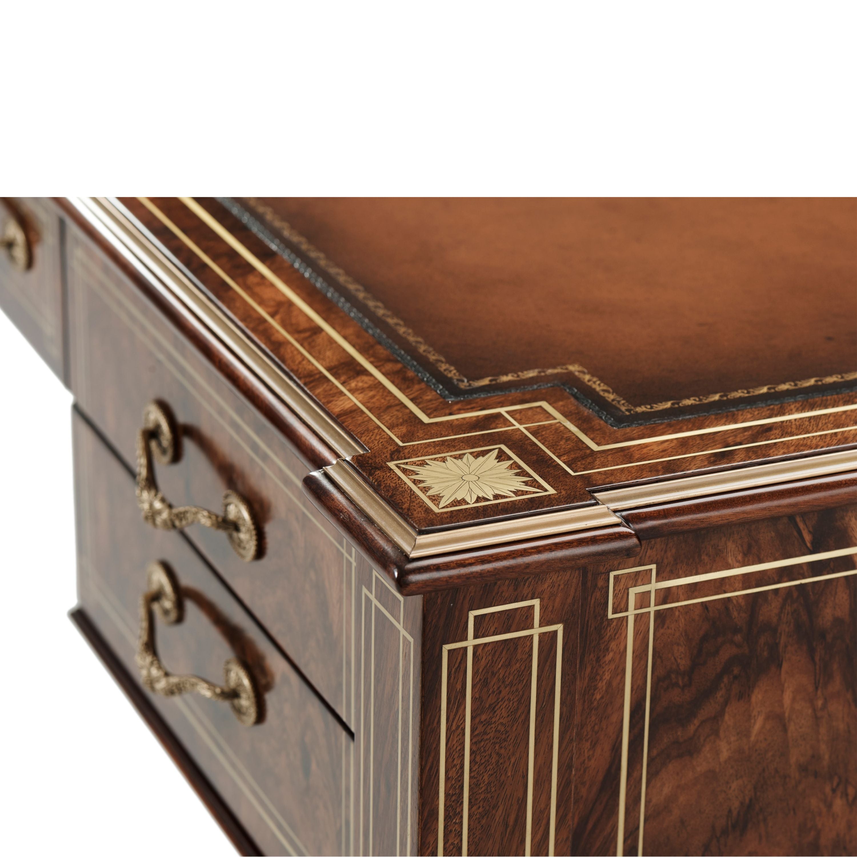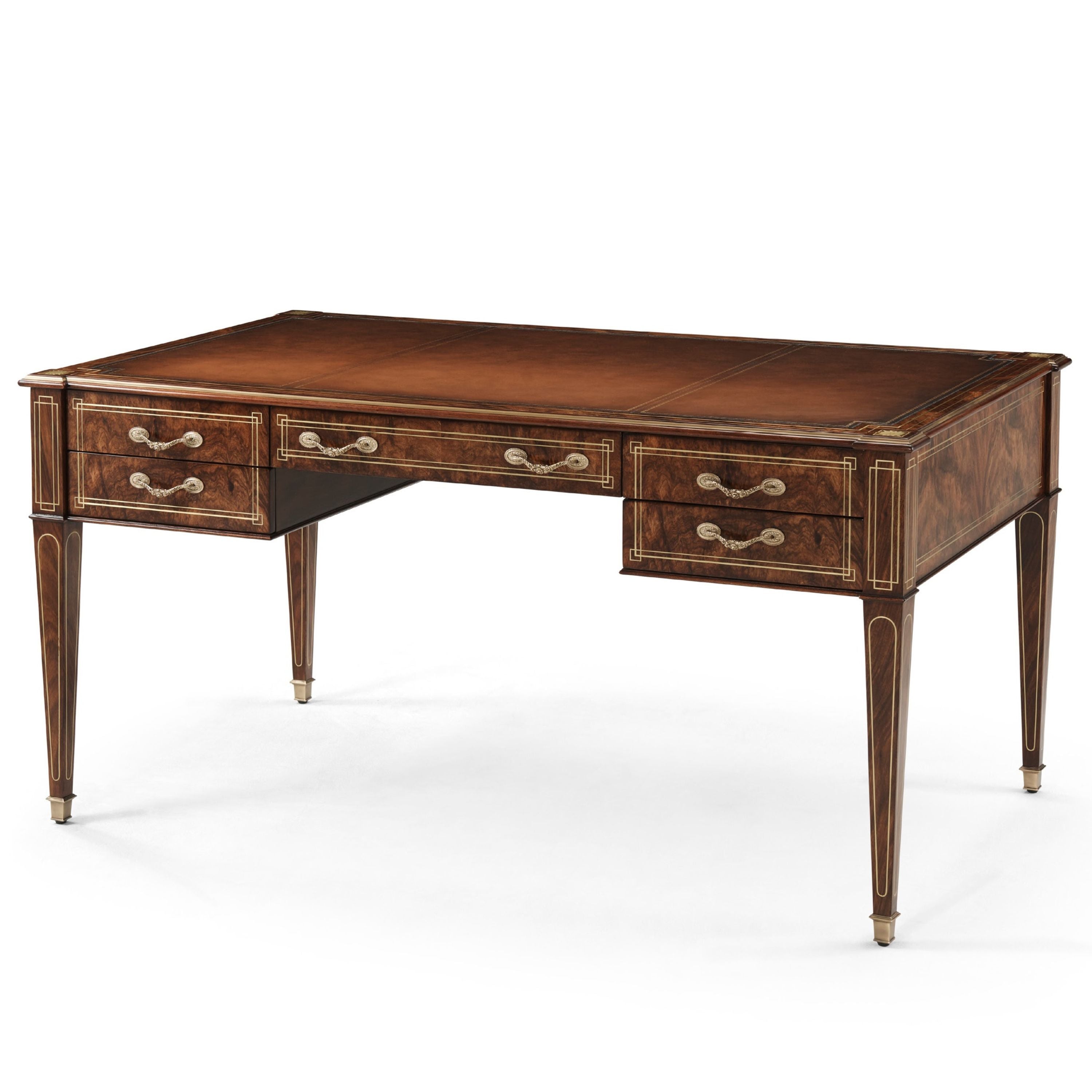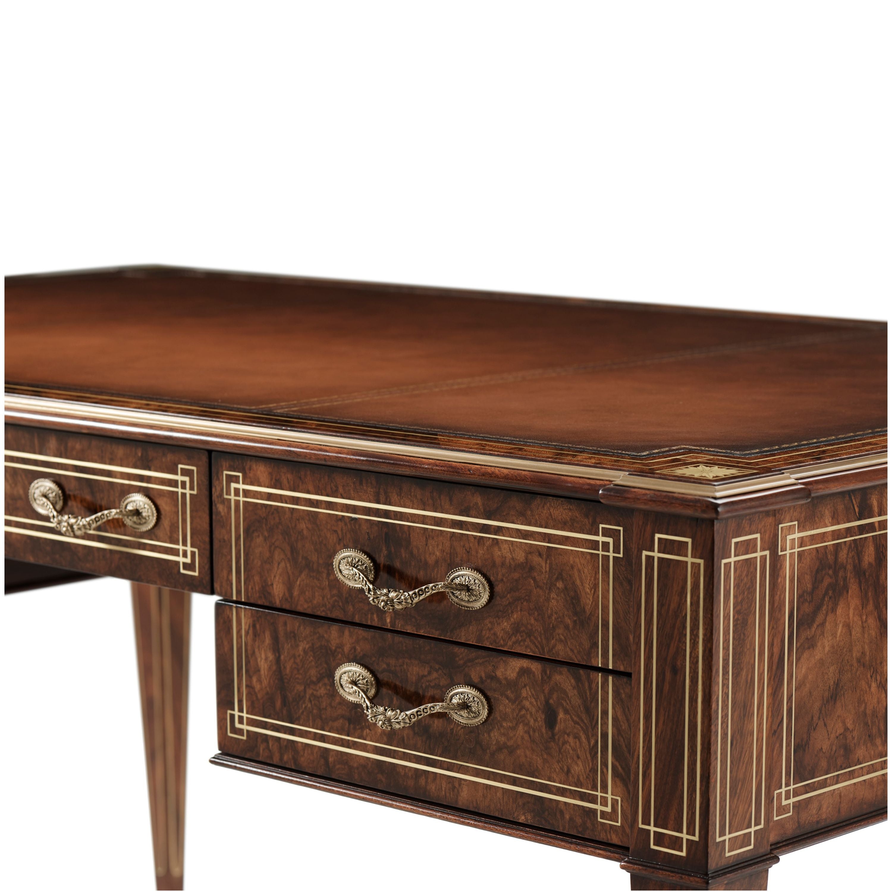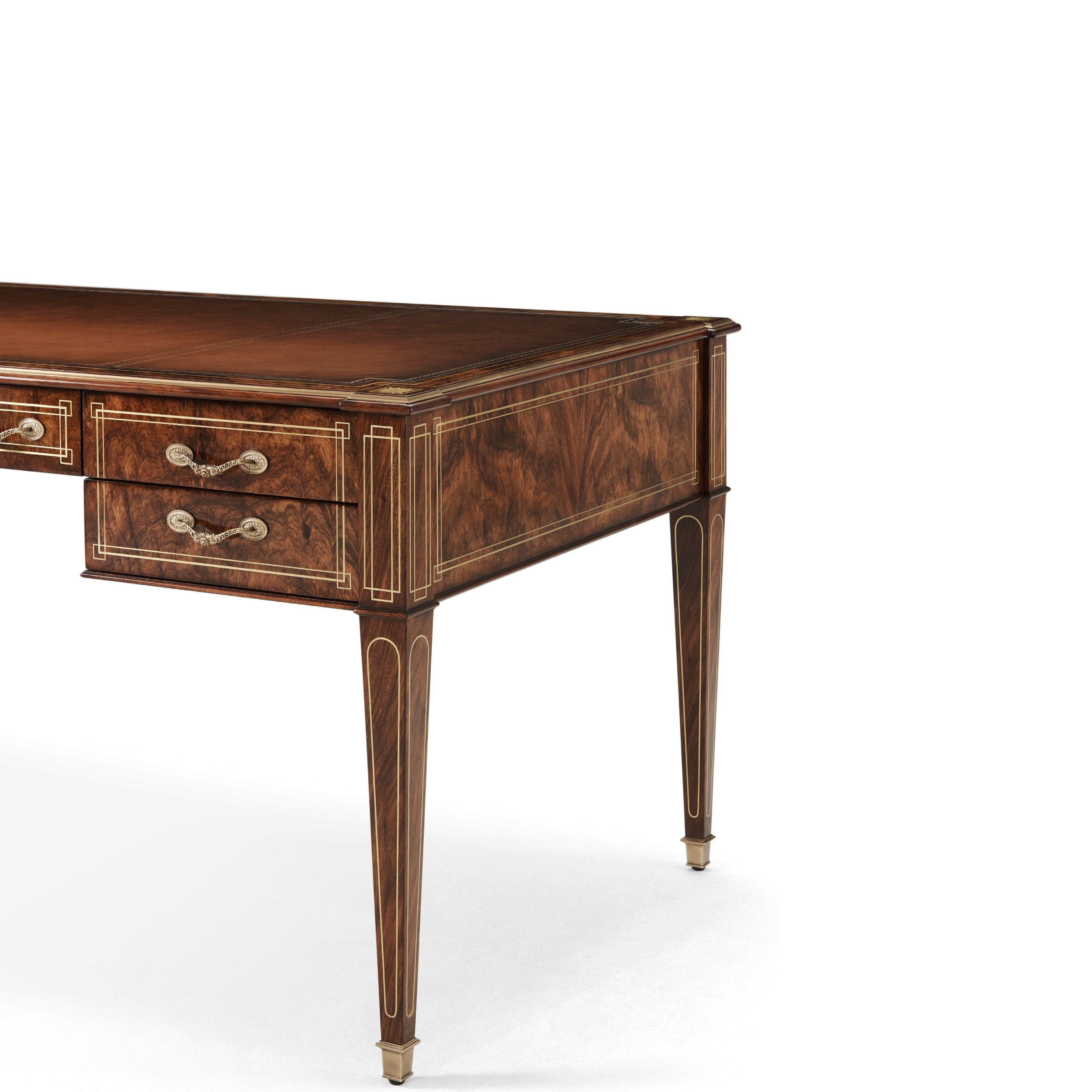 A beautifully crafted writing table designed with a smooth, tooled leather top. This table features brass inlay at the tapered legs and Frieze inspired drawers as well as finely crafted marquetry at the apron.